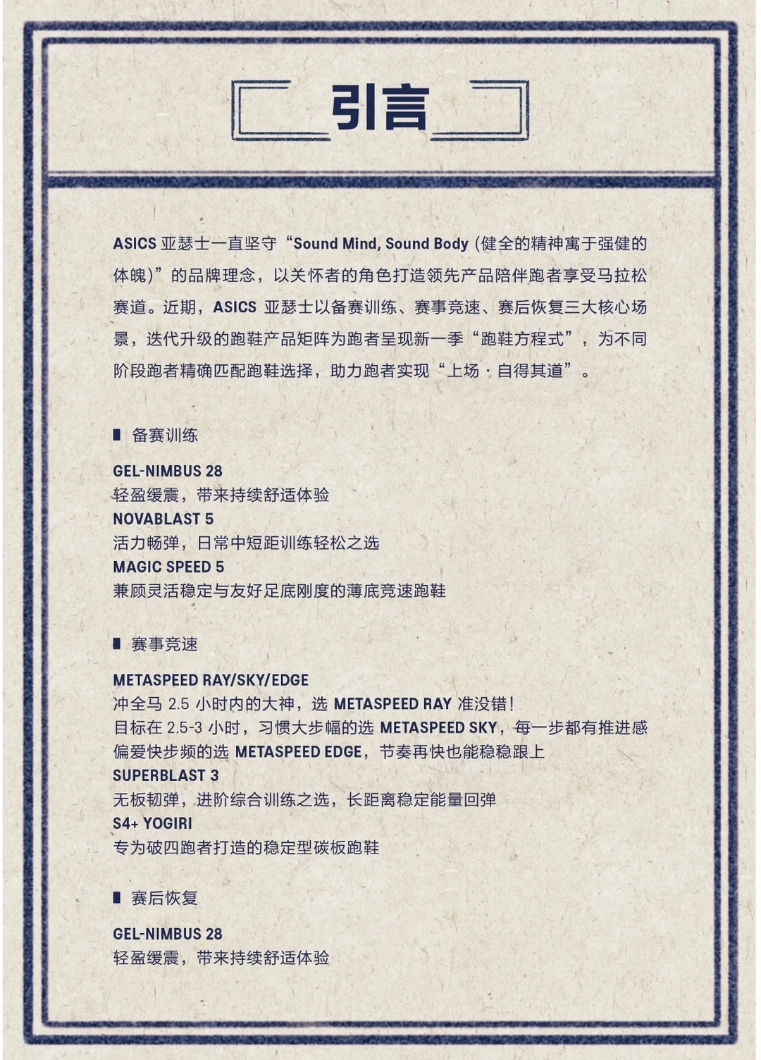 ASICS 亚瑟士此次以“上场·自得其道”为核心概念,构建一场身心共振的跑步体验,引导跑者找到更贴近自我的跑步状态。此次发布会中,应跑者在马拉松赛季的切实需求,ASICS 亚瑟士迭代推出新一季 “跑鞋方程式”产品矩阵,以系统的跑鞋矩阵回应跑者备赛训练、比赛竞速与赛后恢复三大场景需求,帮助不同阶段的跑者在赛场之上,自得其道。