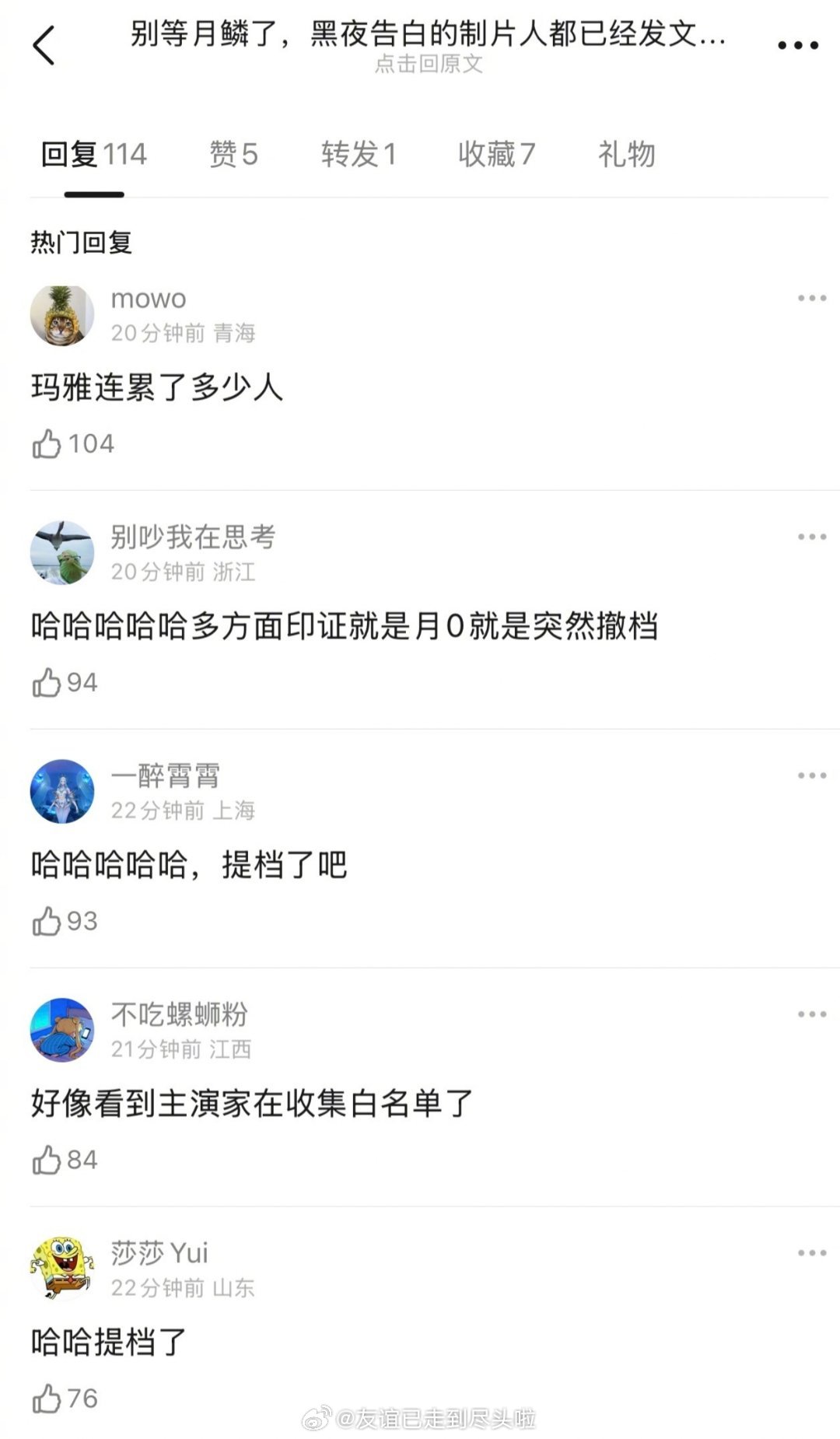 《黑夜告白》制片人发博抱怨,疑似因为月鳞绮纪撤档播不了,导致黑夜告白临时提档,计划被全盘打乱。。。黑夜告白月鳞绮纪郭敬明需要避谶