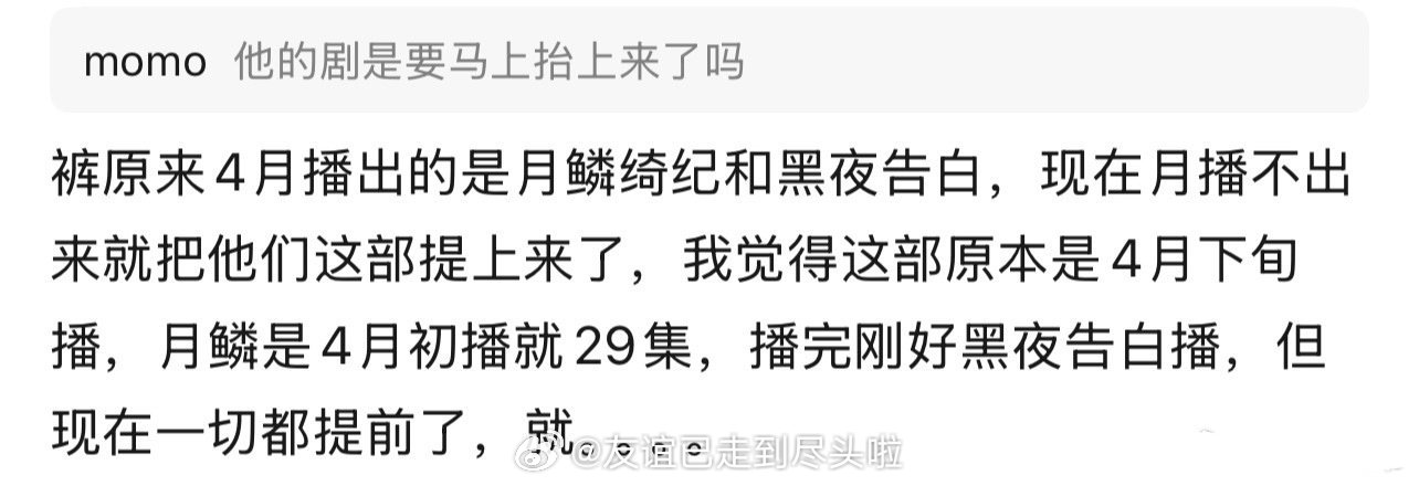 《黑夜告白》制片人发博抱怨,疑似因为月鳞绮纪撤档播不了,导致黑夜告白临时提档,计