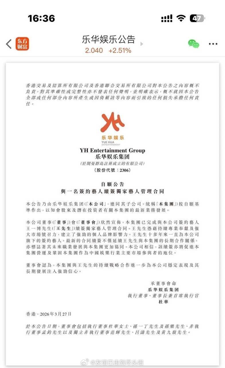 王一博和乐华续约,正式公告出来了,微博也去掉了组合前缀。之前所有瓜主都养gu到期不续,粉丝也觉得合约问题才是导致不进组的最大原因。。。王一博微博改名 王一博乐华续约
