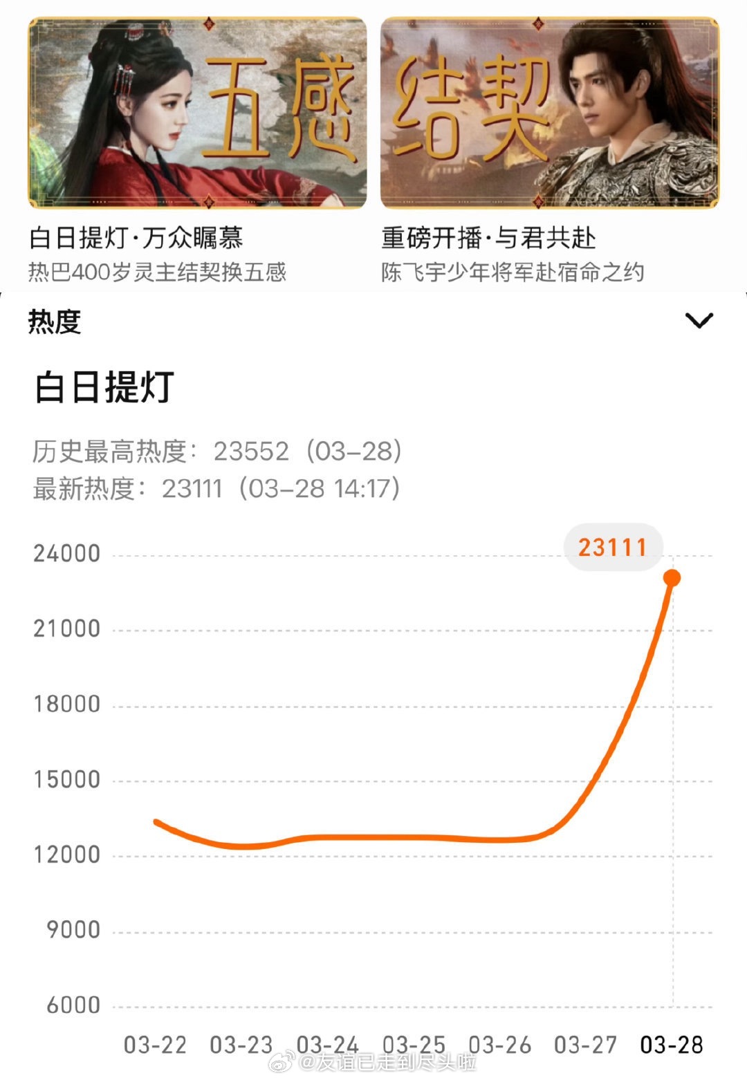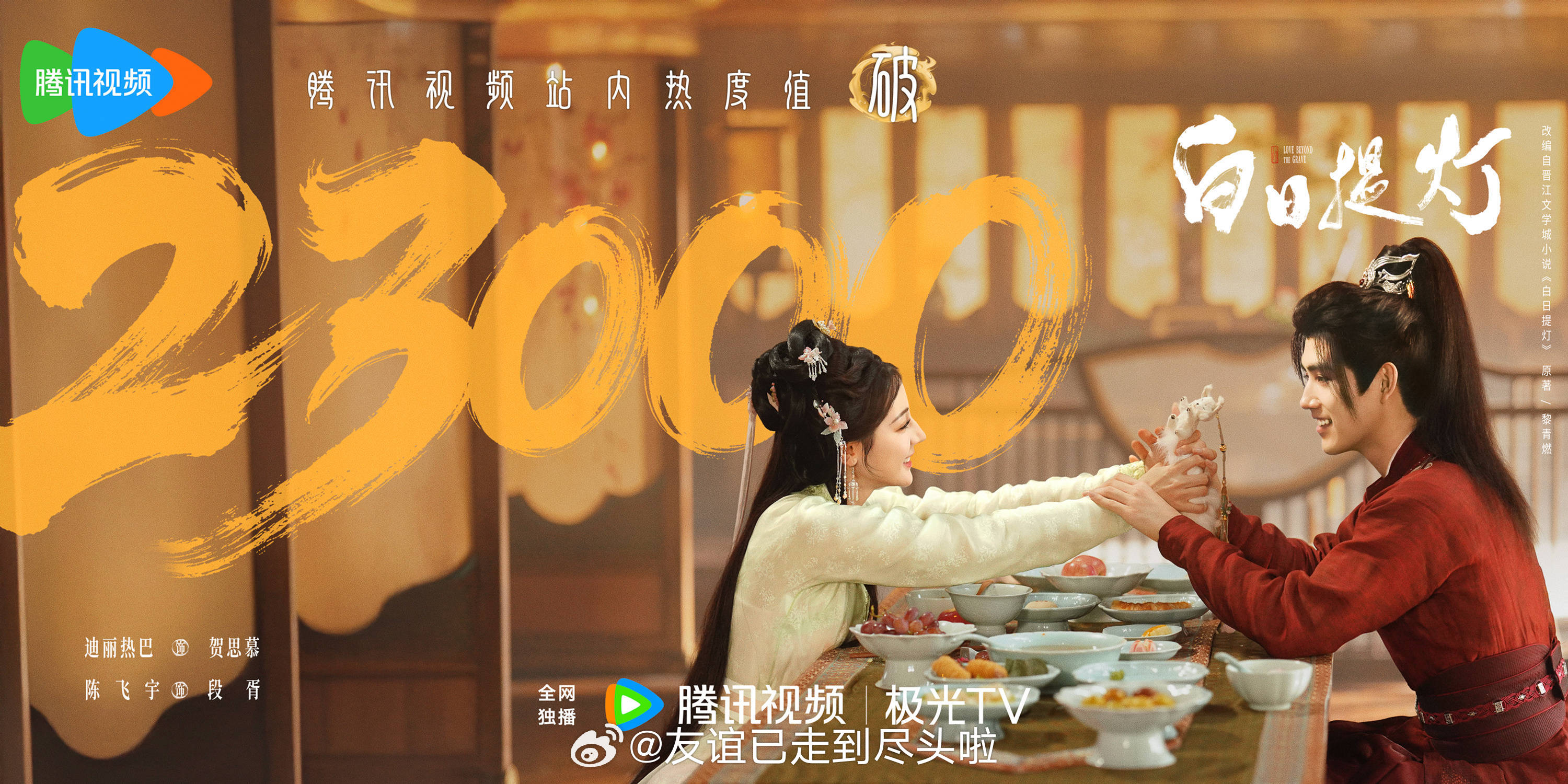迪丽热巴、陈飞宇白日提灯开播表现:热度已破23000,首集五广➕固屏,总广告22