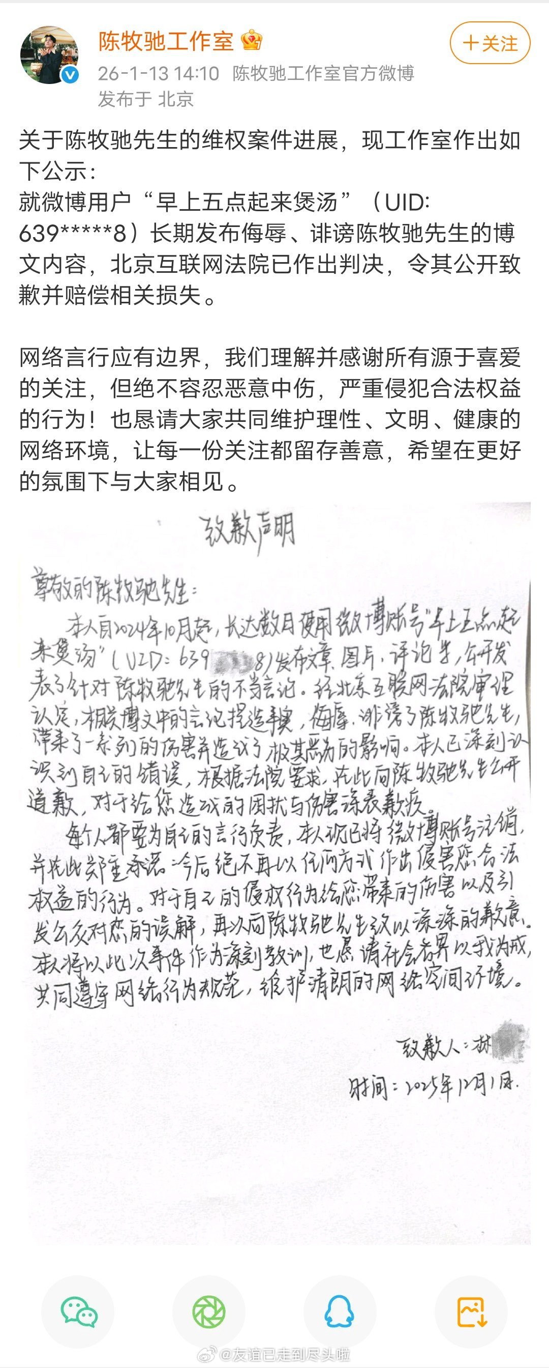 陈牧驰官宣和陈冰结婚生子,之前陈牧驰告黑维权,多位网友因“捏造”陈牧驰陈冰虚假恋情与婚姻关系,手写道歉信,被强制执行赔偿1.51万元。。。陈牧驰陈冰官宣结婚生子