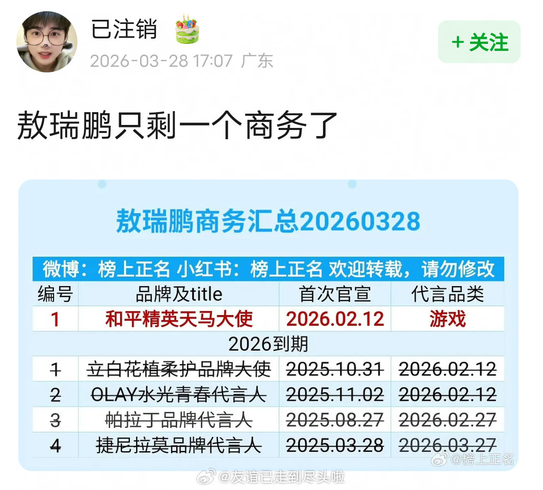 敖瑞鹏只剩一个商务了,瓜主爆料他商务报价700w/年。《朝雪录》的破万红利呢?公司规划也太差了吧,商务资源和敖瑞鹏的流量咖位完全不匹配。