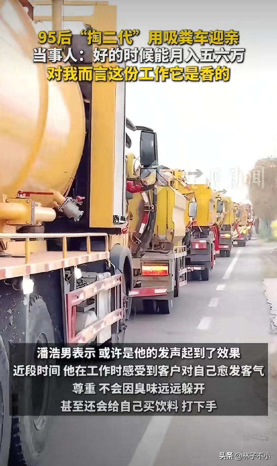 “我通过做掏粪工,获得了目标、梦想、钱和妻子。各行各业都会用自己谋生的车辆当婚车,但我们吸粪车没有,虽然它是臭的,但对于我们而言,它是生活之根本,就是香的。”潘浩男对记者说。