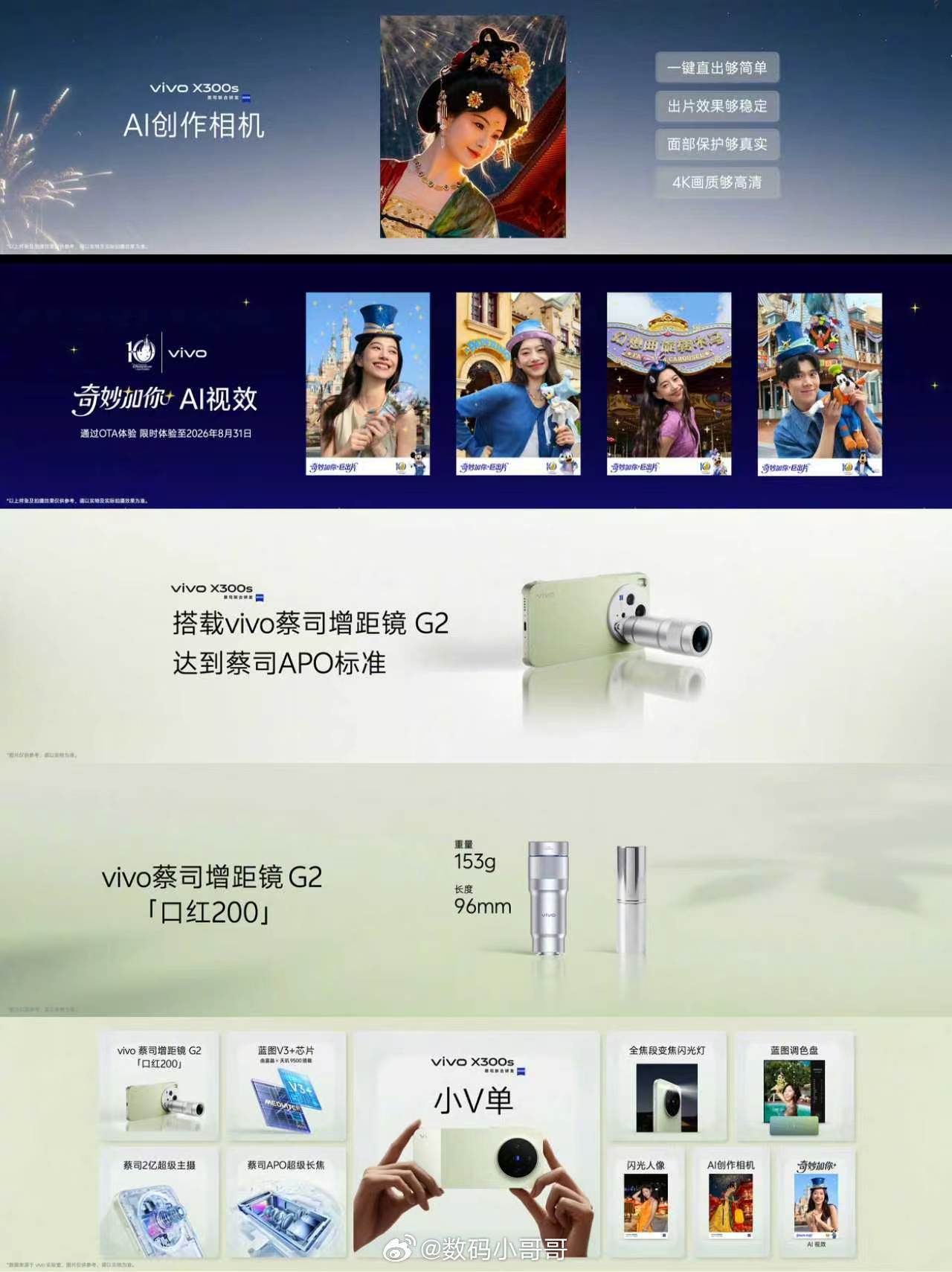 vivo x300s超能小v单 不愧是超能小V单,影像实力直接拉满!蔡司2亿主摄+APO超级长焦,搭配蓝图V3+芯片,出片稳又强。全焦段变焦闪光灯,逆光多人也能拍得均匀好看。十余种胶片风格+全新蓝图调色盘,创作超自由。AI创作相机直出高清大片,还有迪士尼奇妙加你AI视效趣味拉满。搭配口红200蔡司增距镜,平时Super,周末直接Ultra!