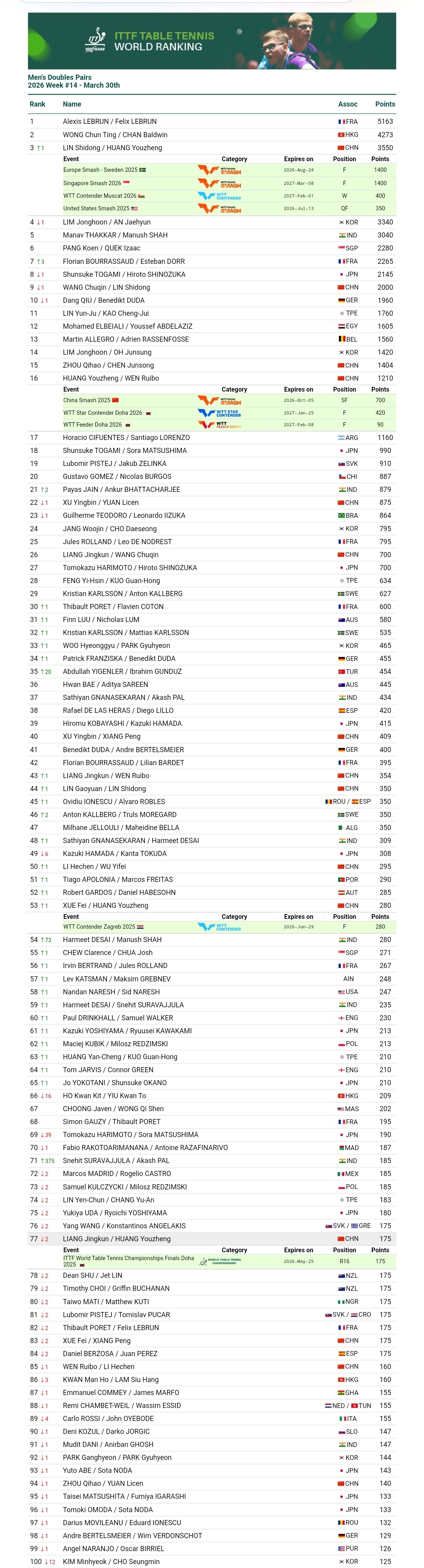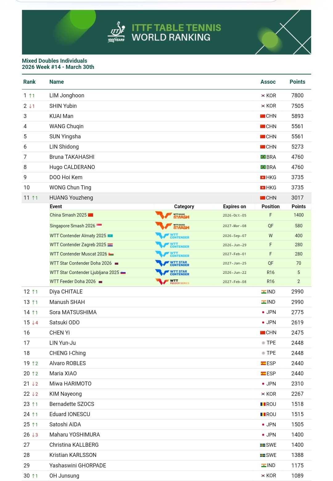 政在这里黄友政 🏓国际乒联2026年第14周世界排名🏓男子单打 第51位(⬆️1位)男子双打个人积分 第4位混合双打个人积分 第11位(⬆️1位)🔎男子双打方面黄友政/林诗栋 第3位(⬆️1位)黄友政/温瑞博 第16位黄友政/薛飞 第53位(⬆️1位)🔎混合双打方面黄友政/陈熠 第9位(⬇️1位)黄友政/石洵瑶 第25位