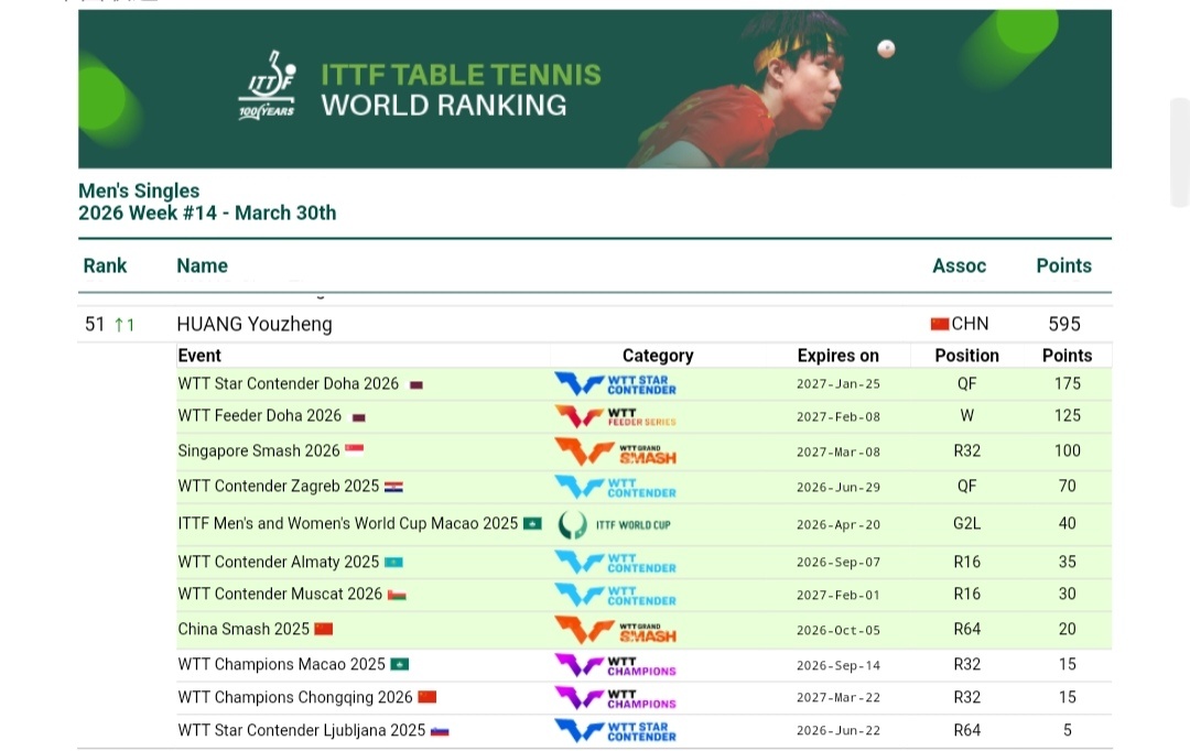 政在这里黄友政 🏓国际乒联2026年第14周世界排名🏓男子单打 第51位(⬆