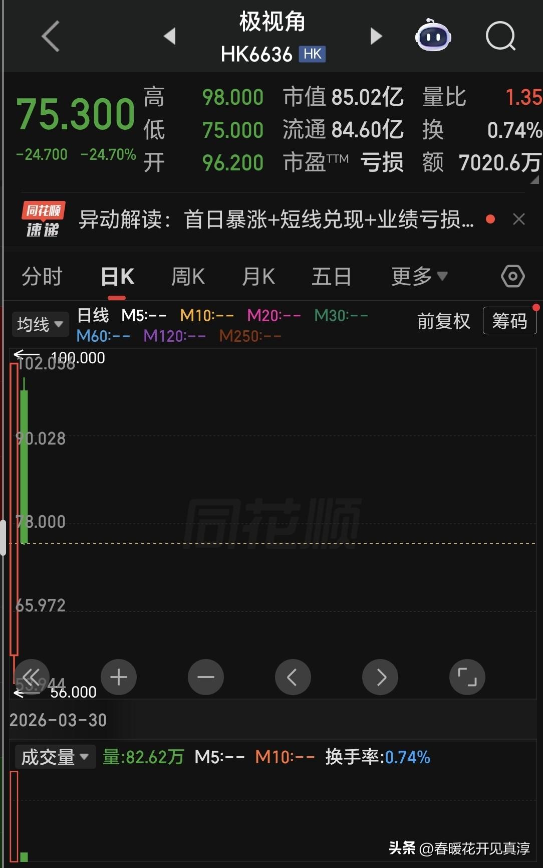 昨天港股上市了一家人工智能企业,叫极视角,盘中有一些震荡,但是最终收盘收在高位,并且收在了100港币的整数位,当时我是觉得非常神奇的。