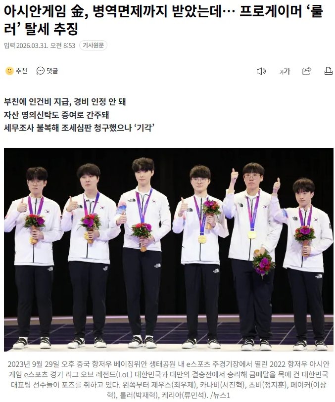 Naver新闻头条标题:亚运会金牌,甚至获得兵役豁免的职业玩家“Ruler”面临逃税指控