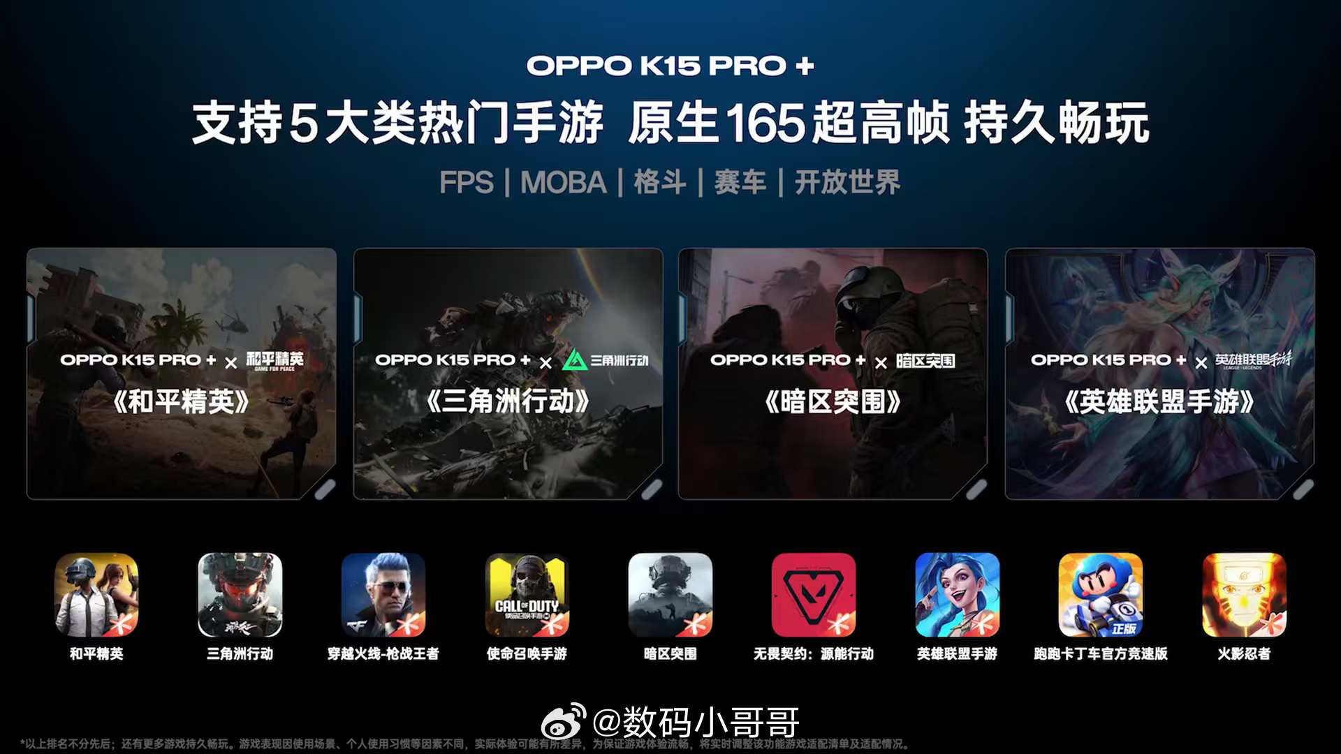 OPPO K15 Pro 系列OPPO K15 Pro+这配置太顶了吧!妥妥的专为顶级玩家打造的赛级神装,全面加一档!6.78英寸165Hz高刷屏,丝滑到飞起;四发声单元同轴双扬,视听直接拉满。还有超感触控芯片+灵犀按键+专业陀螺仪,游戏操作快人一步,天秀操作随便打。天玑9500S旗舰芯,性能直接拉满,再加上3D超声波指纹,湿手也能秒解。全方位都Pro+,游戏党真的可以冲!