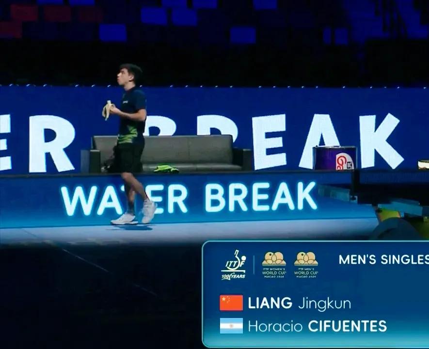有意思的是,对面的阿根廷选手西福恩特斯,连场外教练都没带,局间就安静地吃根香蕉补充体力,反而显得从容。