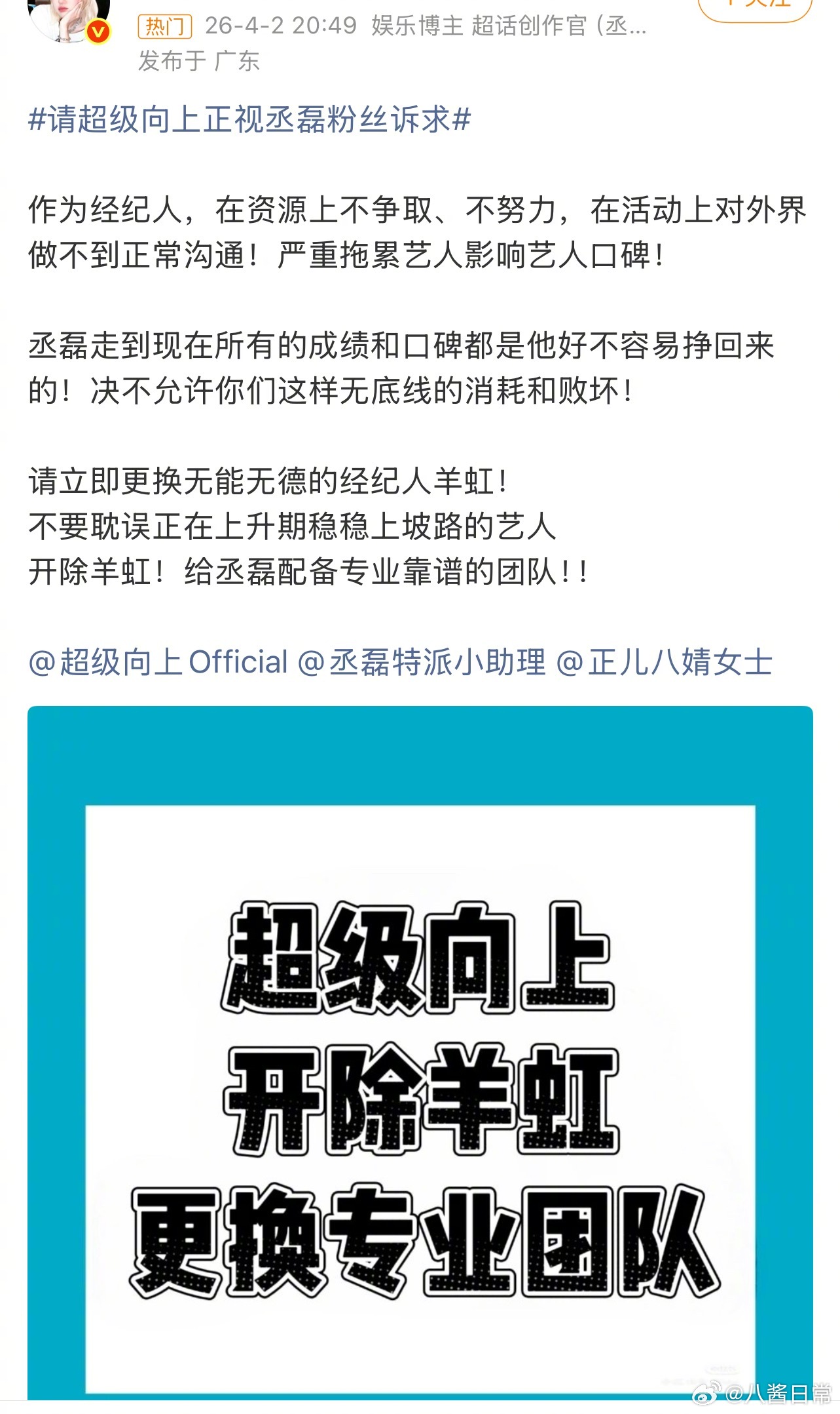 丞磊粉丝维权,要求公司立即换掉现在的经纪人,给丞磊组建专业的团队