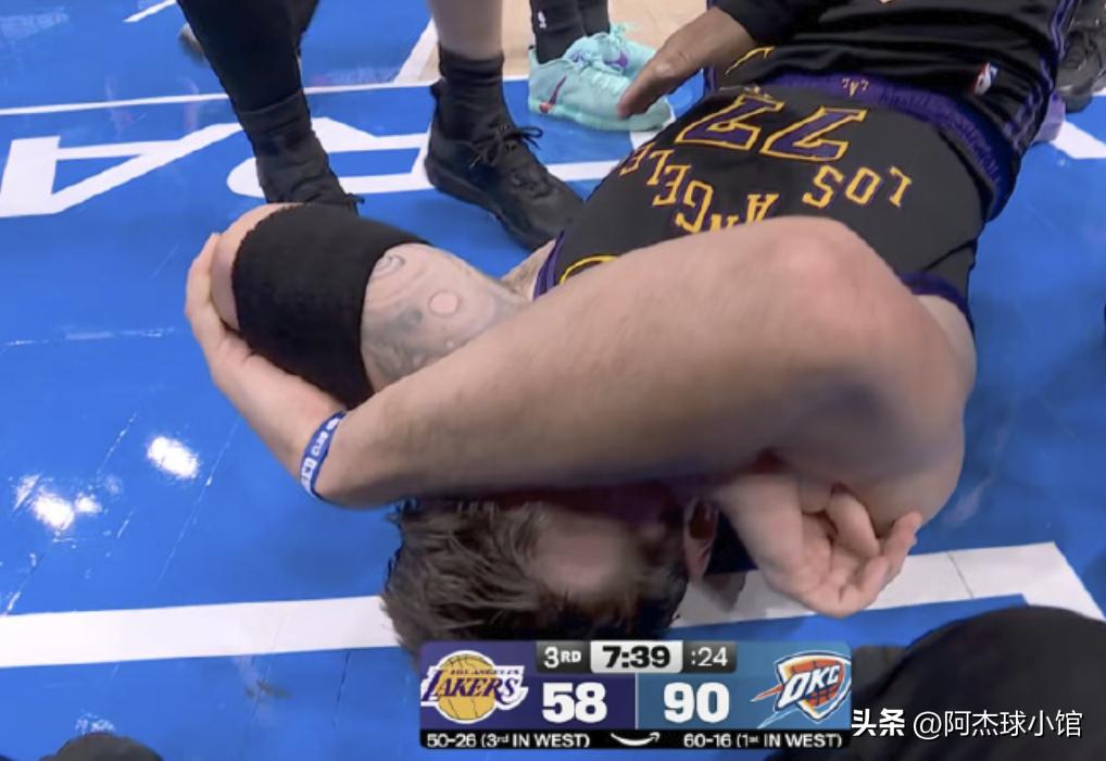 今天湖人与雷霆的比赛第三节,湖人落后多达32分,东契奇在一次突破过程中,突然受伤