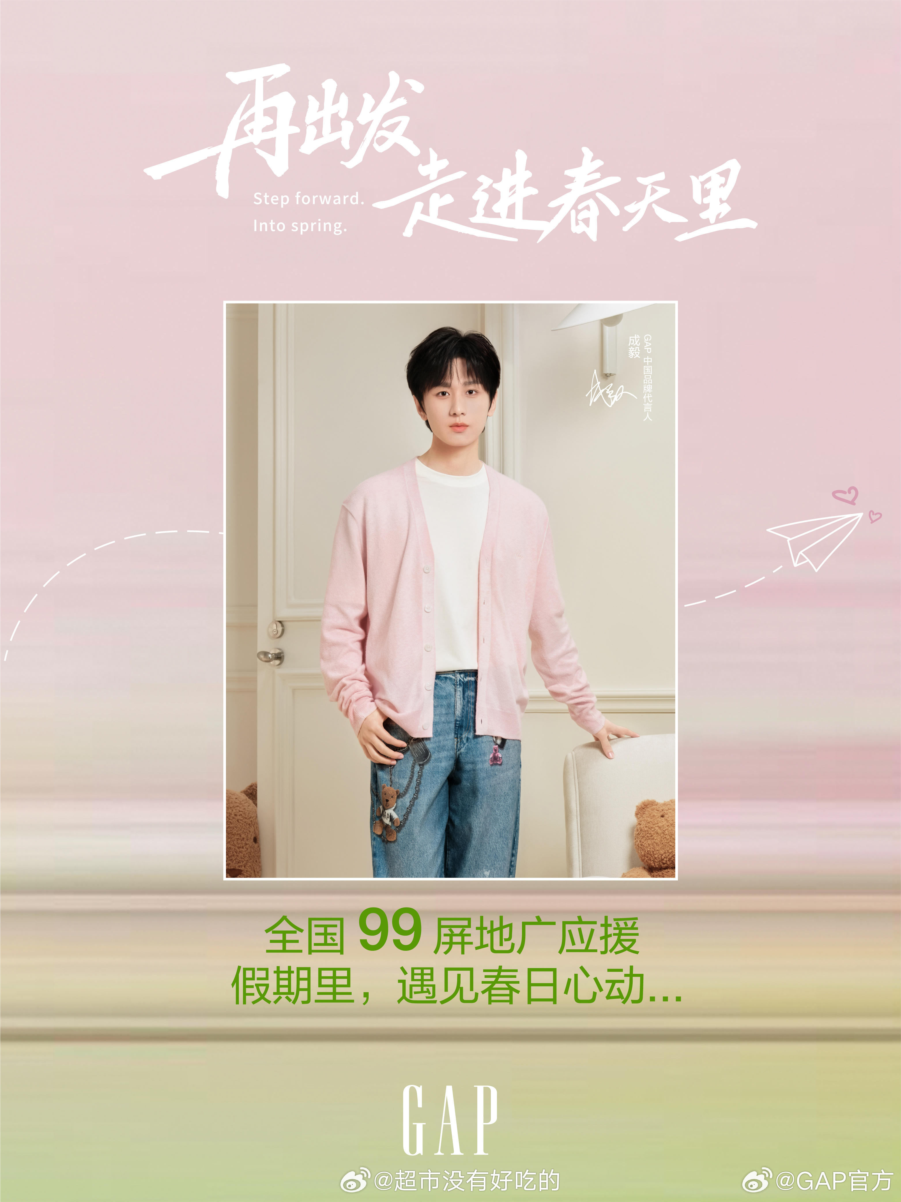 成毅GAP春日新物料GAP还投了99家线下大屏应援来支持代言人牌子眼光真好,代言