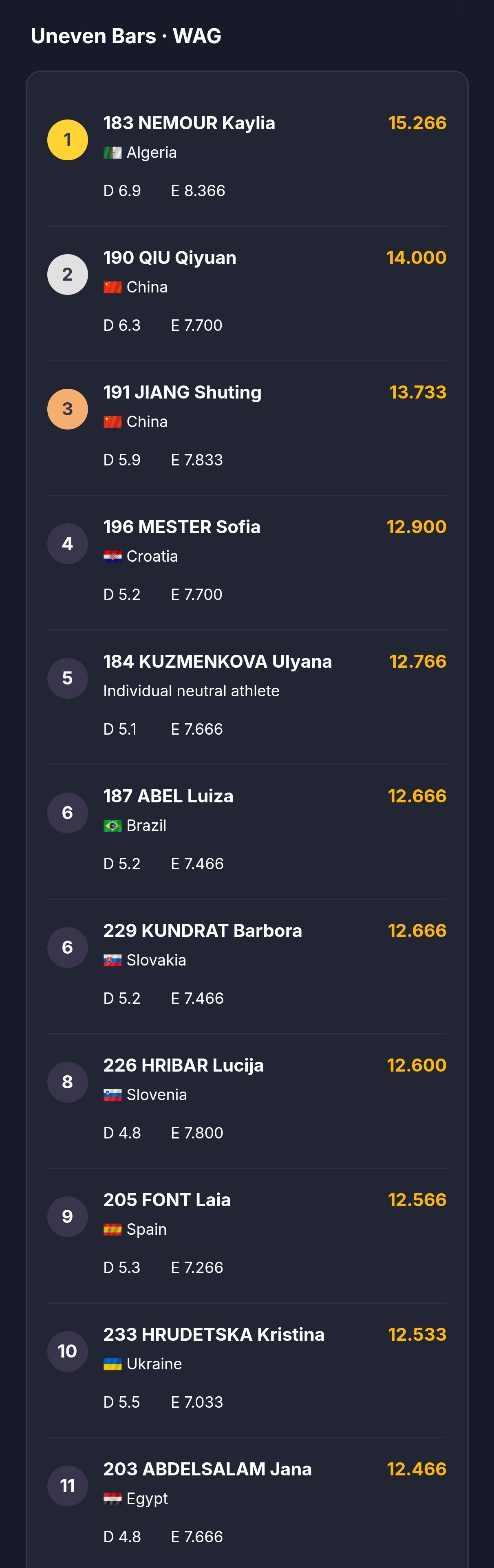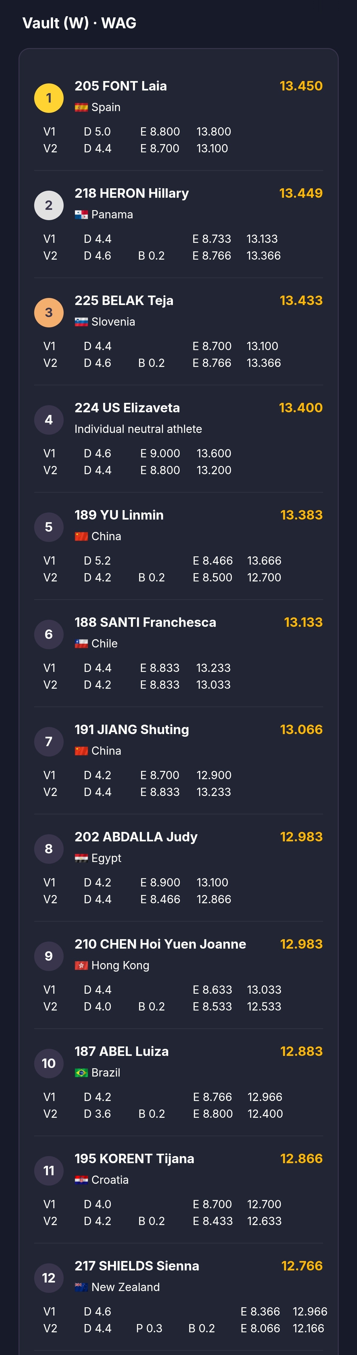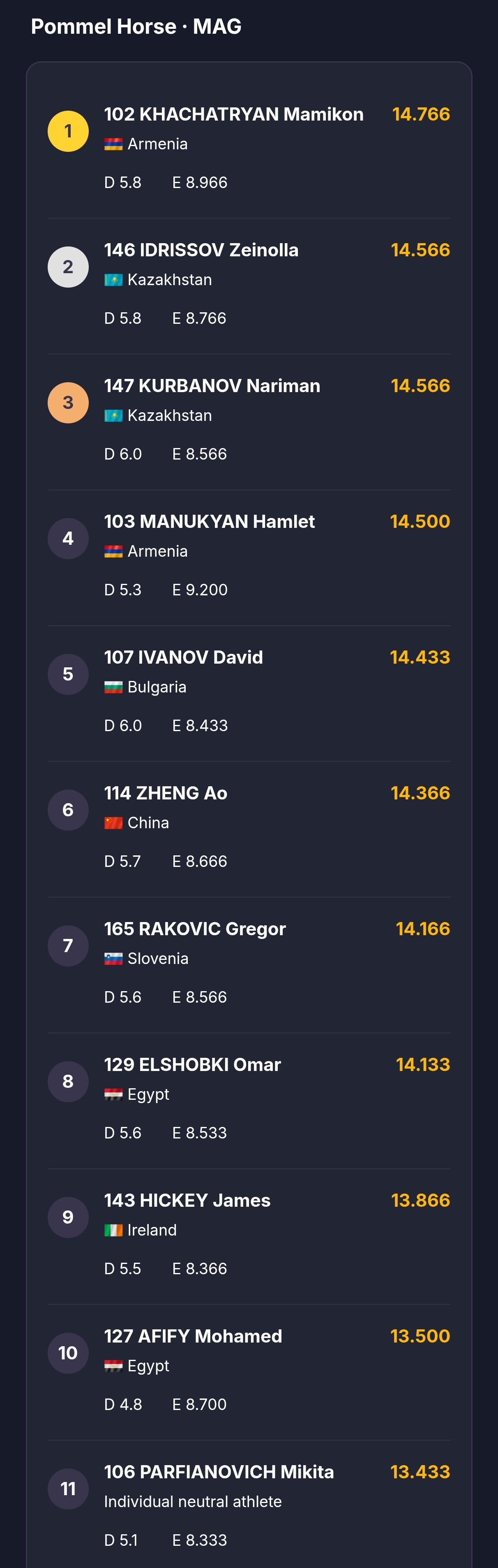 世界杯开罗站资格赛Day1成绩单男子自由操、鞍马、吊环,女子跳马、高低杠截到第1