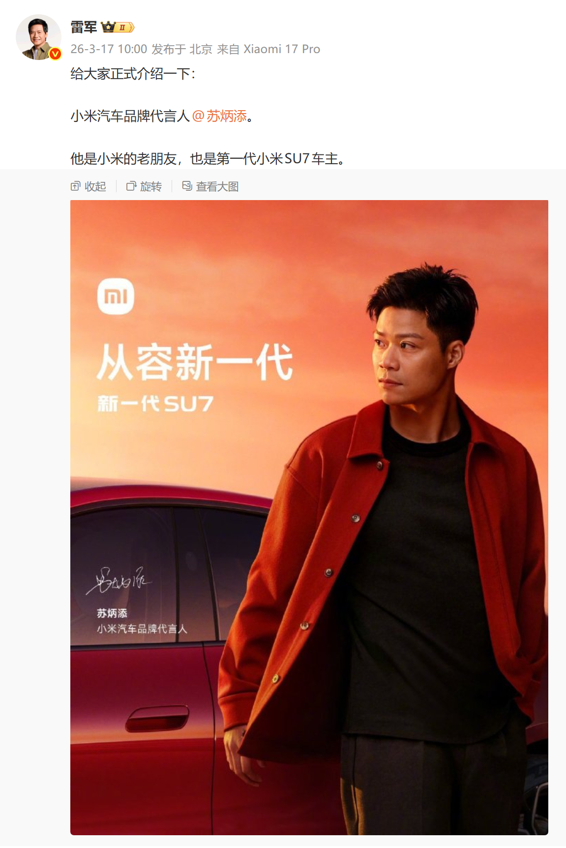 苏炳添官宣代言小米汽车 从赛道到赛道,用传奇续写传奇。苏神真的是 SU7 的完美代言人,太合适了,太权威了。很多人都忘了,苏炳添老师本身就是一代小米 SU7 的车主,24年11月的时候就提车了,既是亚洲飞人奥运冠军,更是小米自己的车主,甚至连名字都这么像。田径赛道的亚洲传奇,代言纽北赛道的中国新星,绝配!
