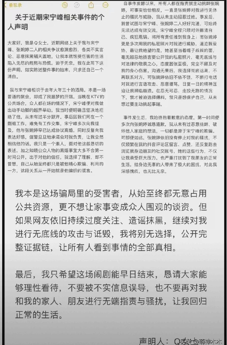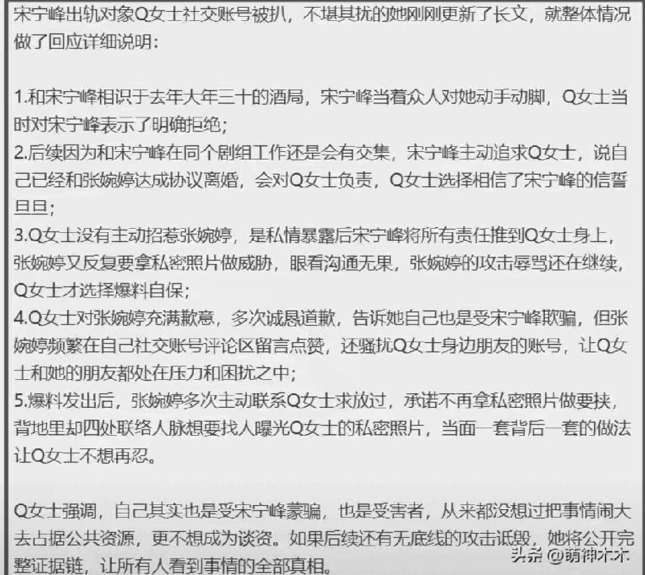 女方Q女士是演员高露的助理,年仅20多岁,比45岁的宋宁峰小20岁,长相神似其前妻齐溪。她发文称被宋宁峰欺骗,对方谎称已签离婚协议,自己才陷入感情。