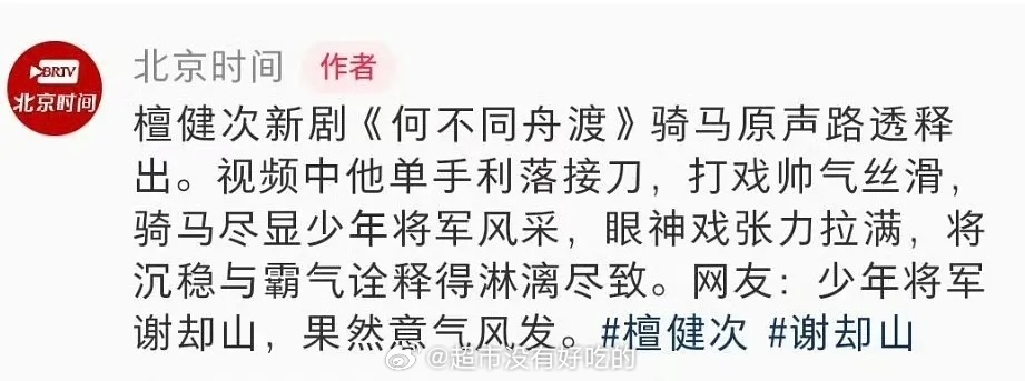北京时间官方账号发的檀健次《何不同舟渡》骑马路透夸檀健次演绎的谢却山沉稳霸气,尽