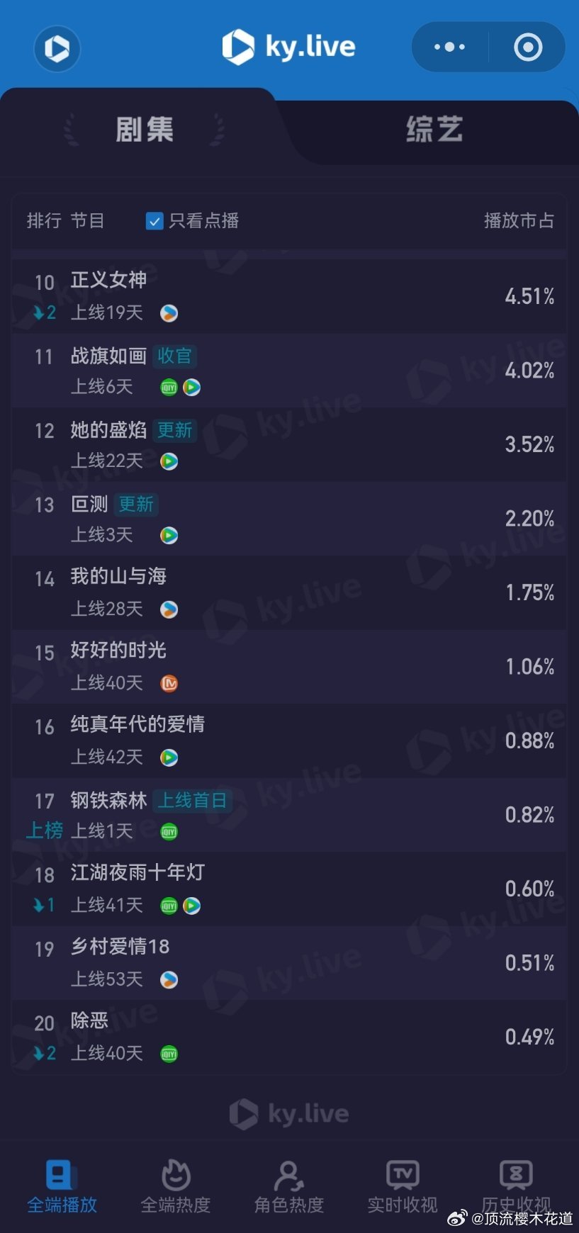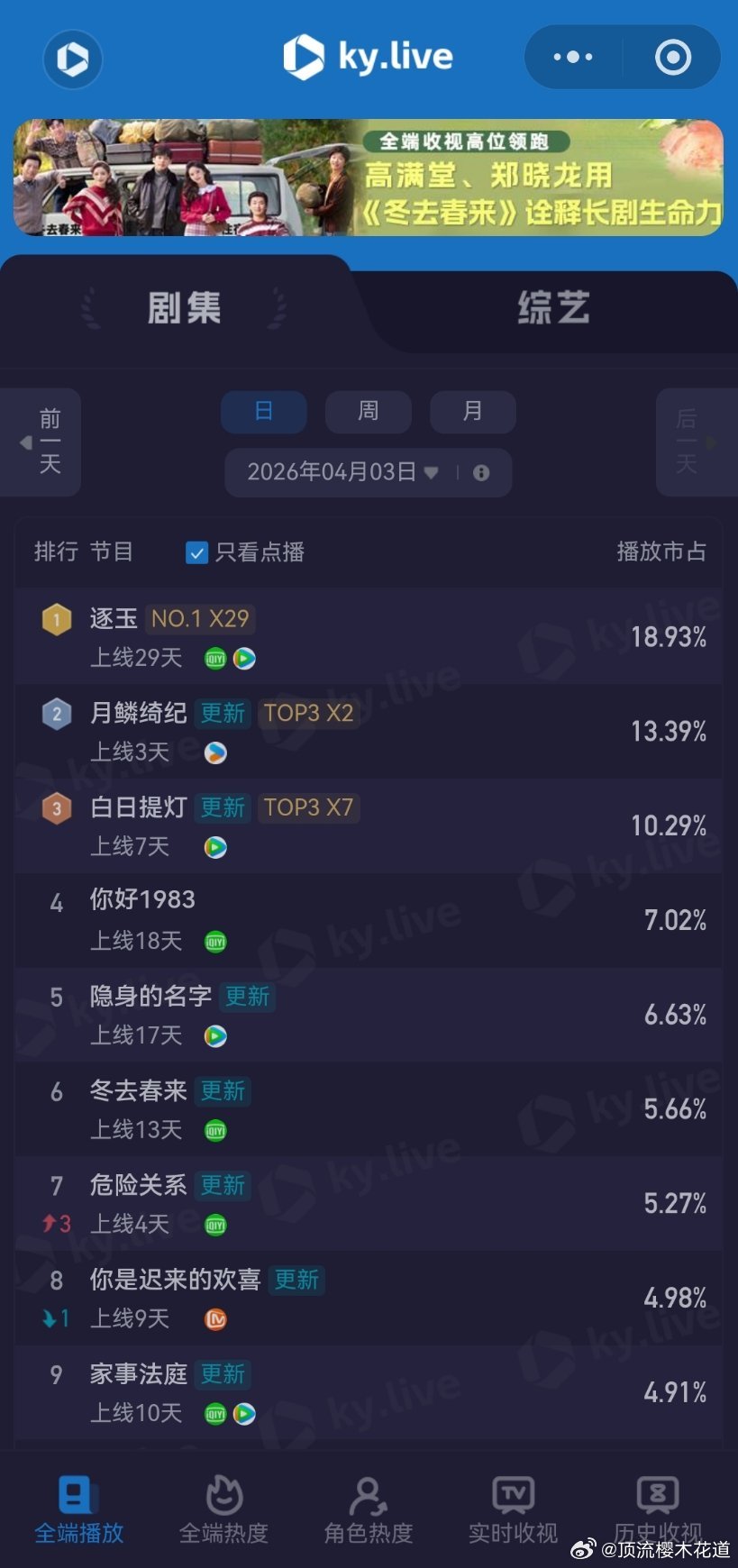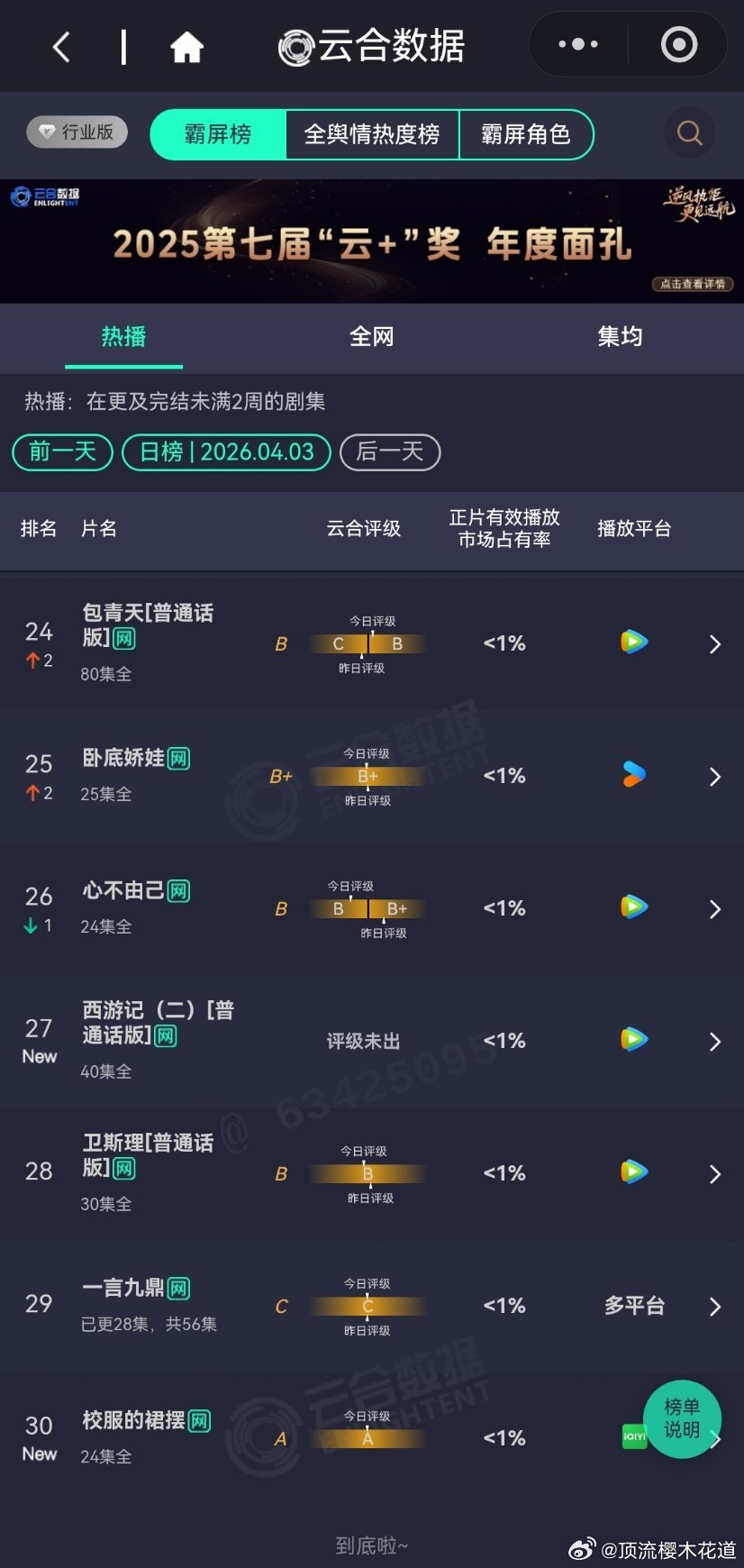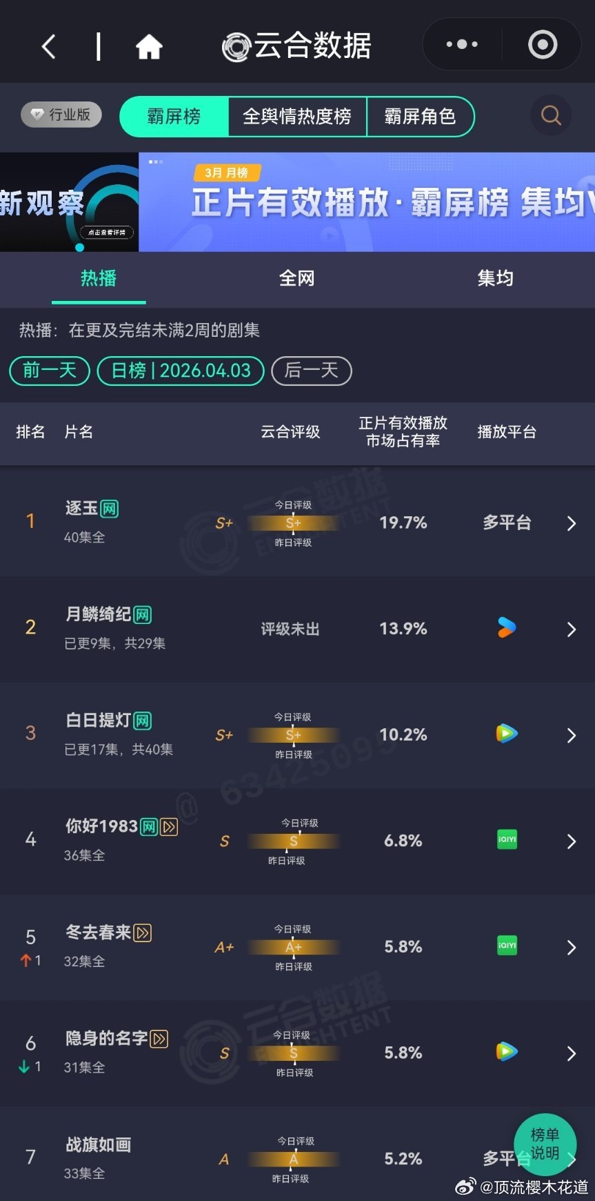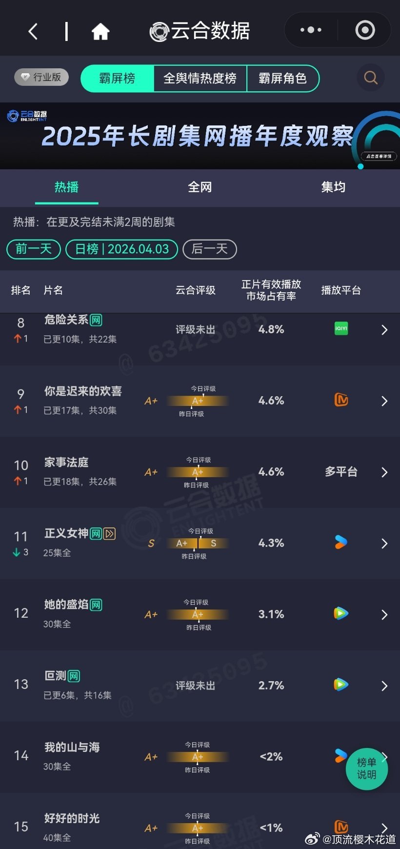 4月3日云合播放占比云合 VS酷云逐玉云合19.7%,酷云18.93%月鳞绮纪云合13.9%,酷云13.39%第三天涨势趋缓,有横盘趋势。白日提灯云合10.2%,酷云10.29%云包场也没有拉起来。家事法庭云合4.6%,酷云4.91%这部剧科普了好多知识,比如律师和法官之间的回避关系。危险关系云合4.8%,酷云5.27%这个数据趋势对于🥝来说,属于严重不达预期的,不过好在集数少,集均也不会很难看。