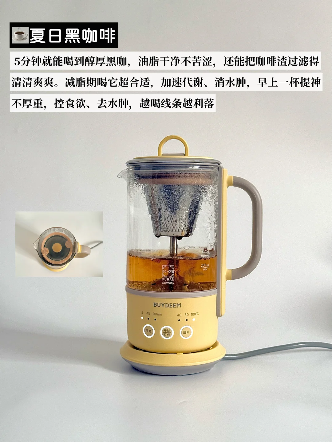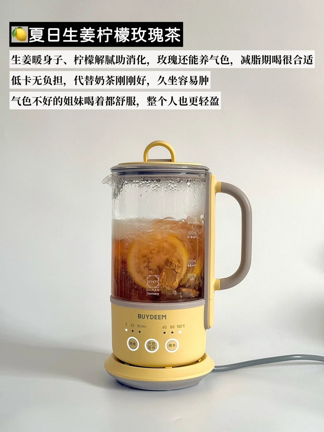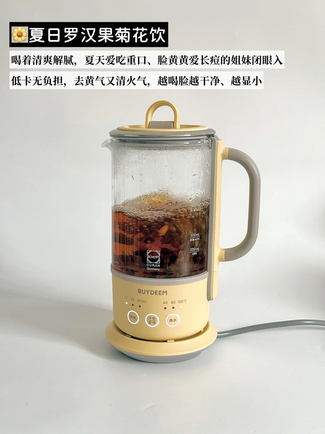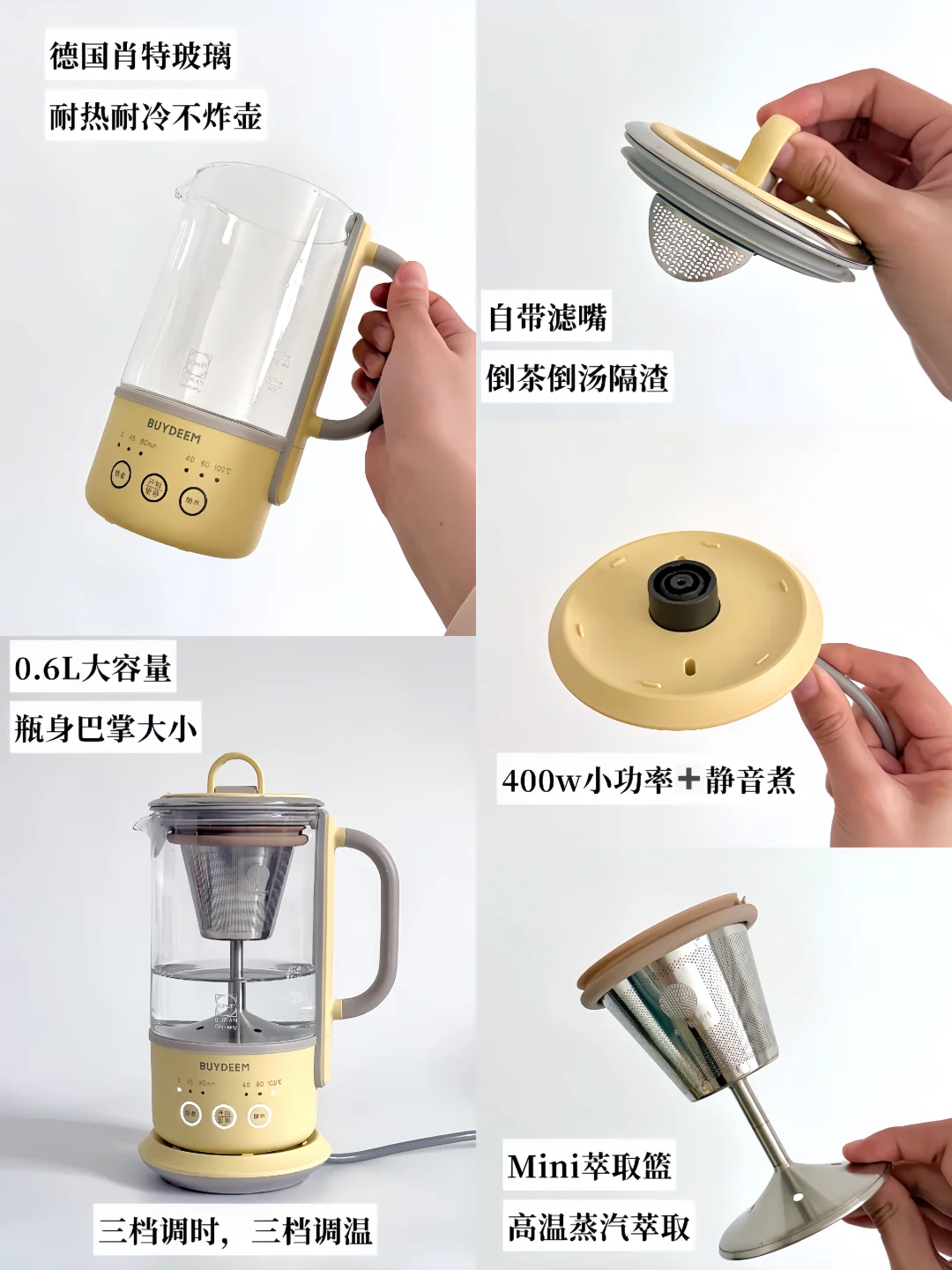 ▪️真心安利我一直在用的北鼎K36养生壶,小小一只放办公桌刚刚好,一点不占地,我几乎天天都在用。壶身采用的是德国肖特玻璃,材质很安心,耐冷热温差也耐用,喝着放心。功能也很够用,3档调时+3档调温,煮完还能自动保温,忙忘了喝也不怕凉。分体式设计,冲一冲就干净;自带滤嘴,茶汤可以直接倒,对懒人太友好了。
