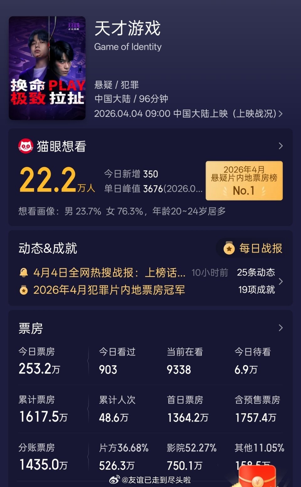 网友吐槽彭昱畅,丁禹兮的新电影《天才游戏》,只要申请一个无息助学贷款就能解决的事,废了老鼻子劲儿,应该叫《蠢才游戏》只能说我天朝自有国情在,所以很多编剧只能生拉硬扯人造苦恼,观众也很难入戏