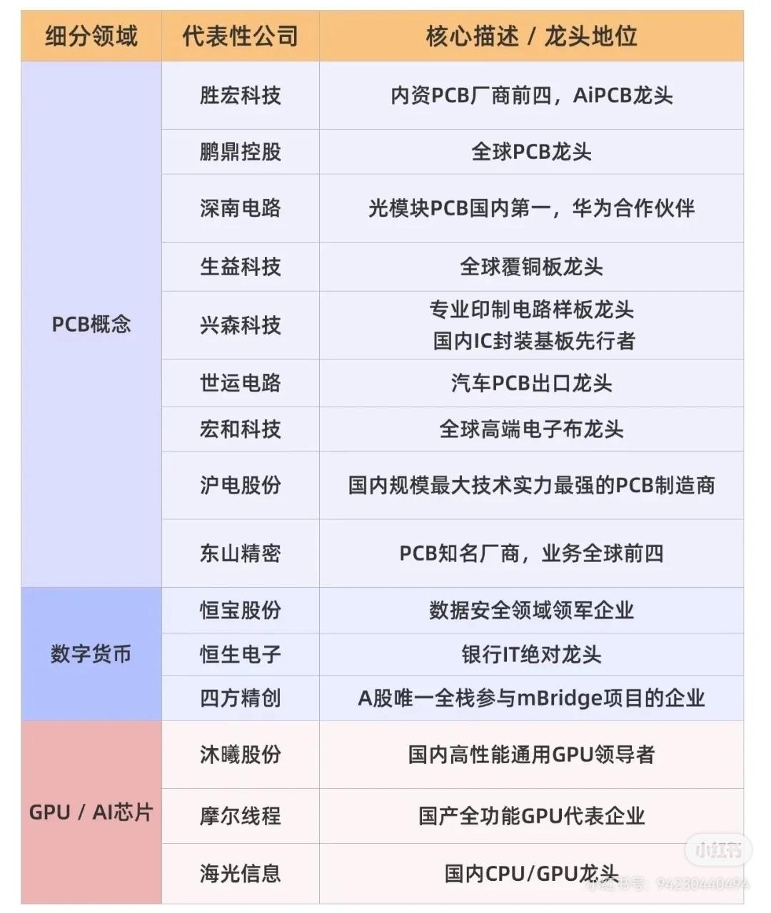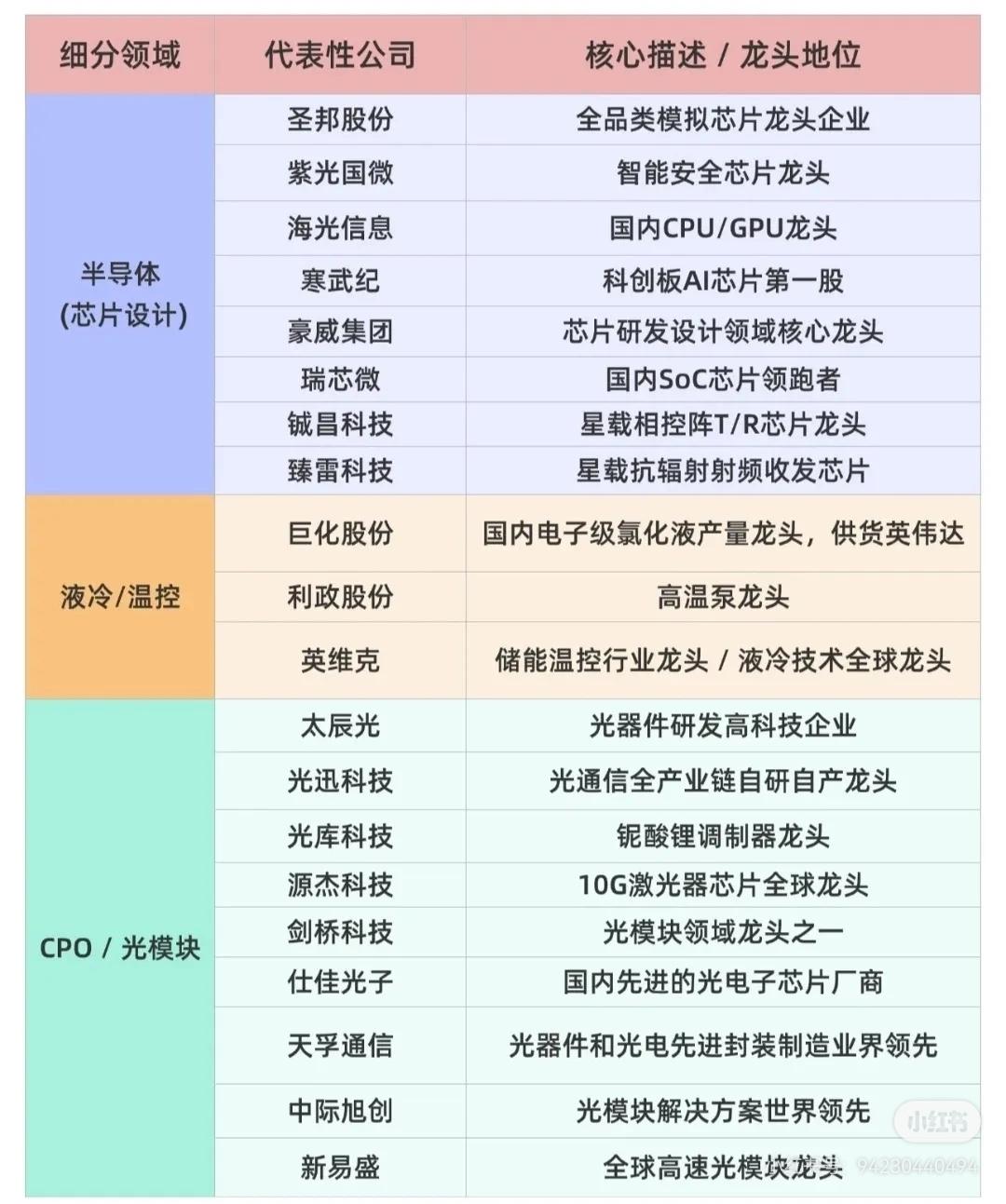 - 海光信息:国内CPU/GPU龙头(与“半导体(芯片设计)”领域重复,系跨领域布局)