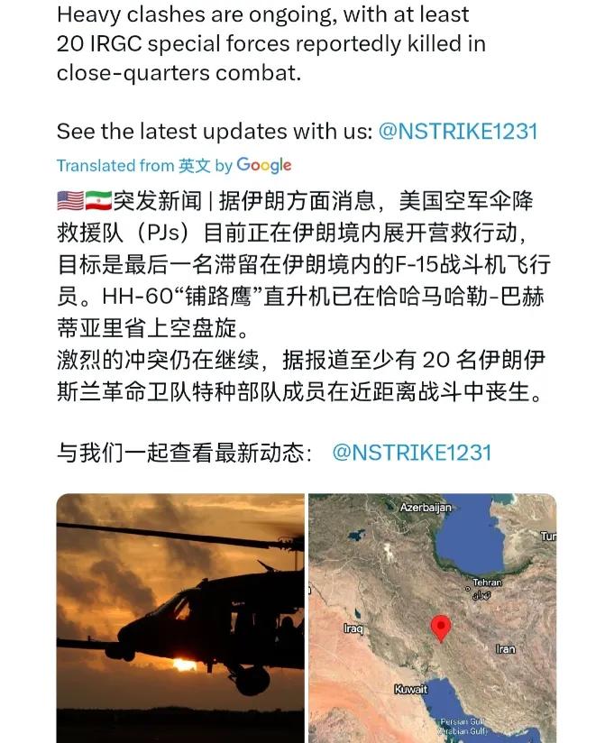 遭遇美国特种部队,伊朗革命卫队死战不退!超过 20 名革命卫队成员战死!4 月 5 日,外媒报道称,美国空军伞降救援队员(PJ)正在伊朗境内展开行动,营救 F-15 战机的一名幸存飞行员。