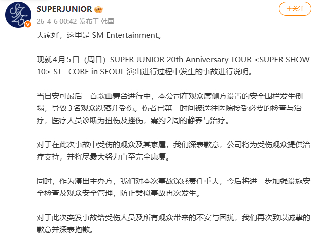 SM回应SJ演唱会粉丝坠落事故SJ演唱会坠落粉丝报平安