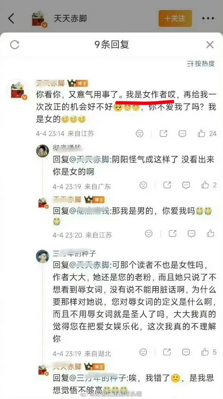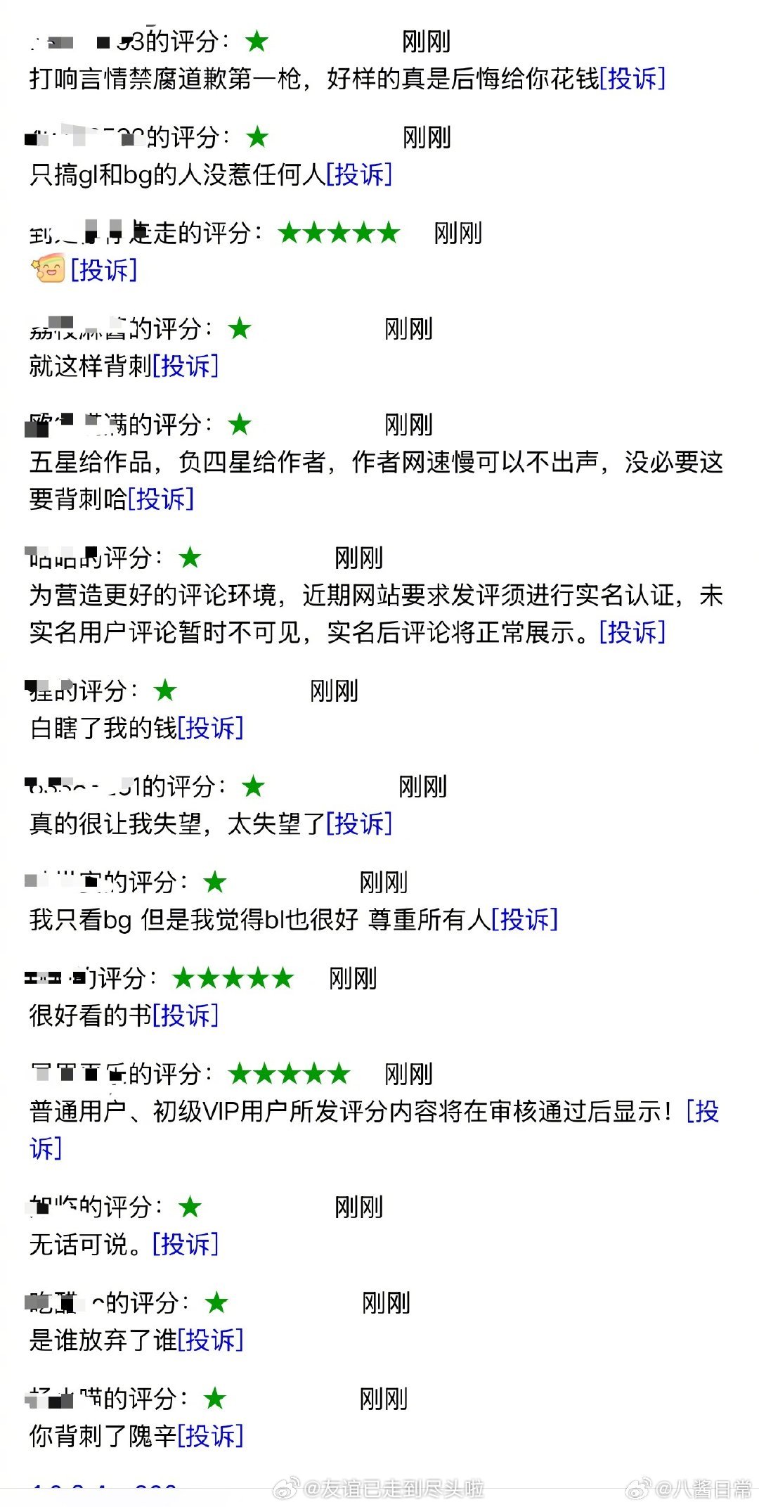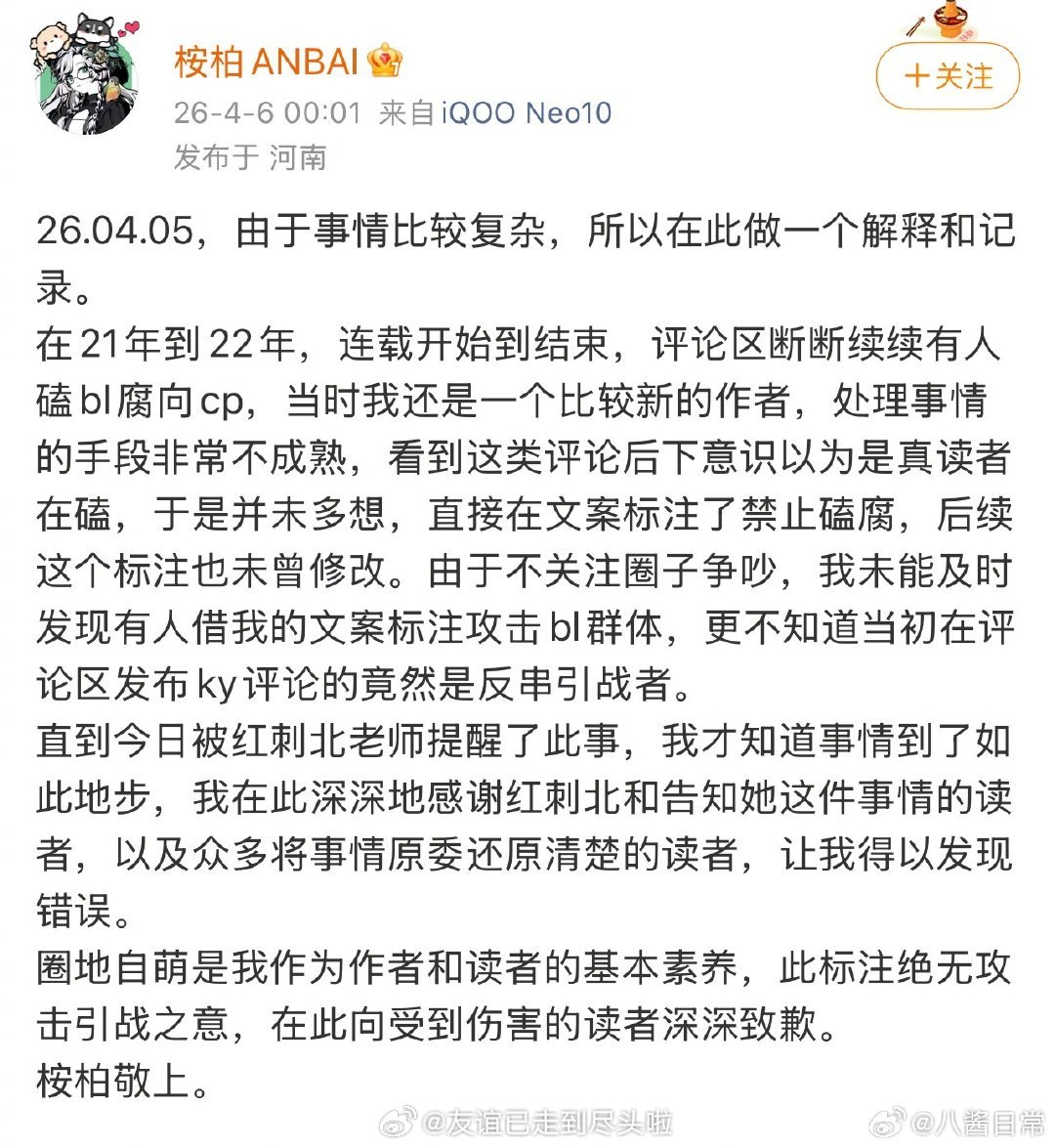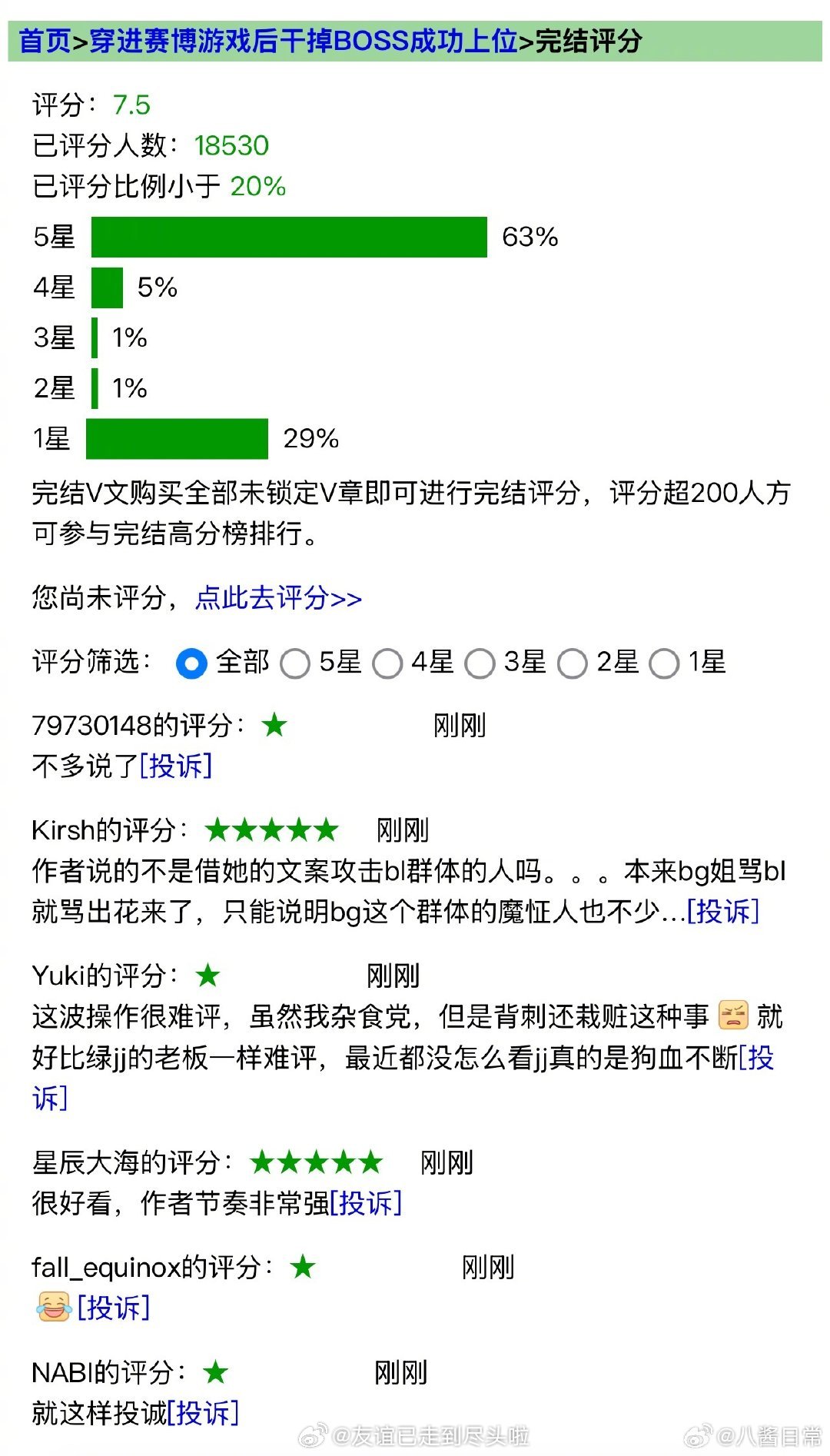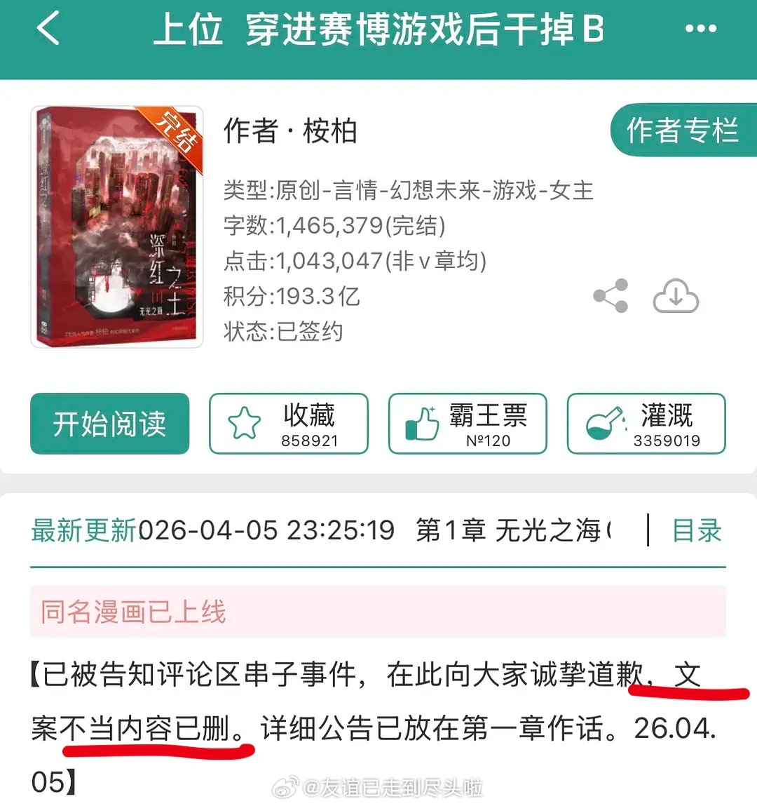 我到现在都不明白,一开始是红刺北阴阳读者惹出来的事情,到最后桉柏出来发疯投诚为之前简介禁止嗑腐道歉,现在赛博的超话和作者评论区都是失望的读者,反而红刺北安然无恙了 现在赛博评分马上要掉破7,赶跑了老读者,腐女也不是很买账,还有人建议嘉行去索赔嘉行 穿进赛博游戏后