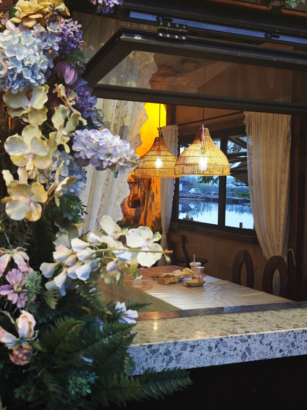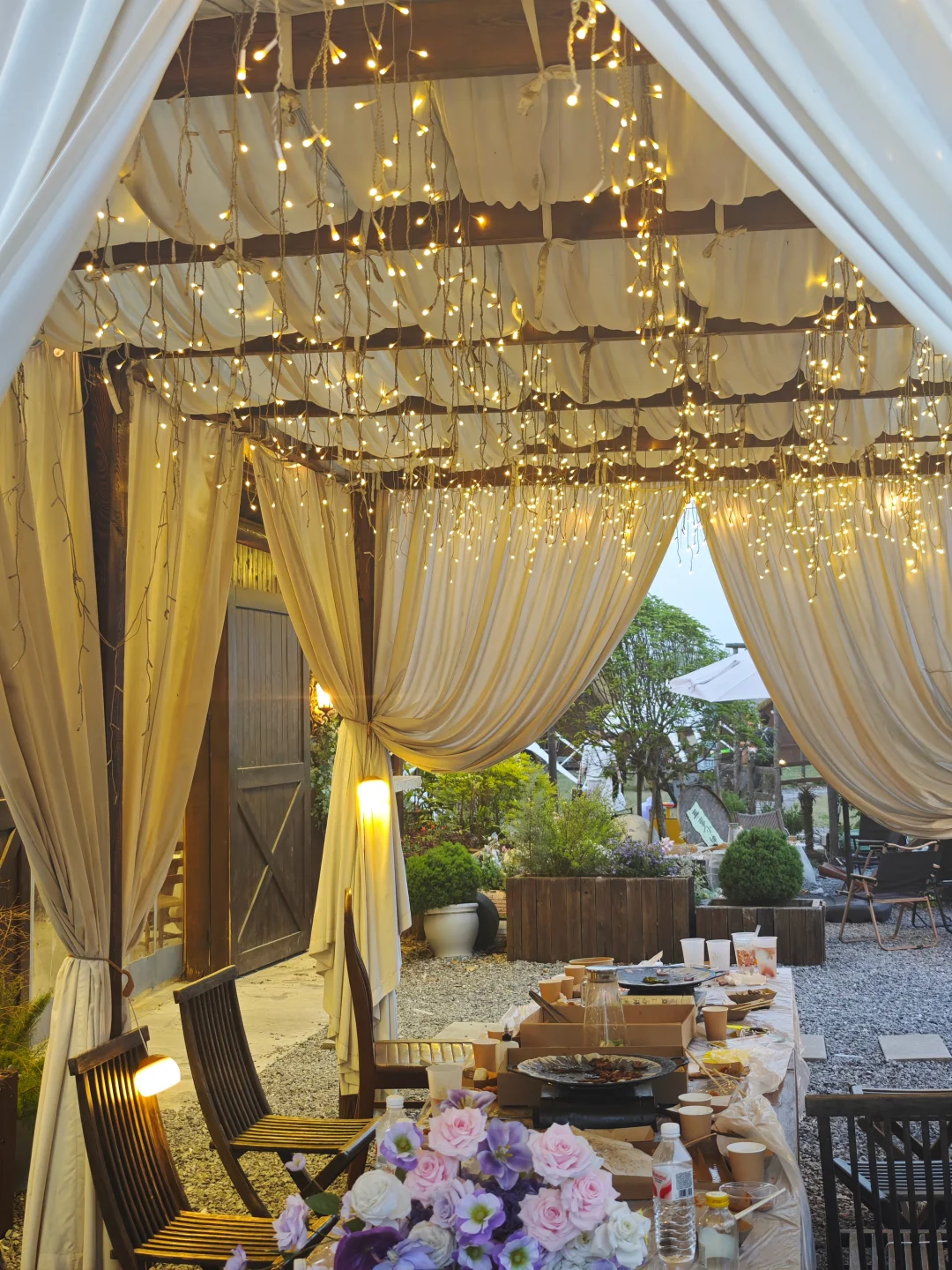 不想带装备也行!这里有超有氛围的营地咖啡吧⛺,全是鲜花布置,随手一拍都是森系大片🌻。我们还整了户外烧烤套餐,食材新鲜分量足,坐在天幕下吹着东湖的风撸串,或者跟朋友围炉煮茶,这种松弛感在市区真的很难得