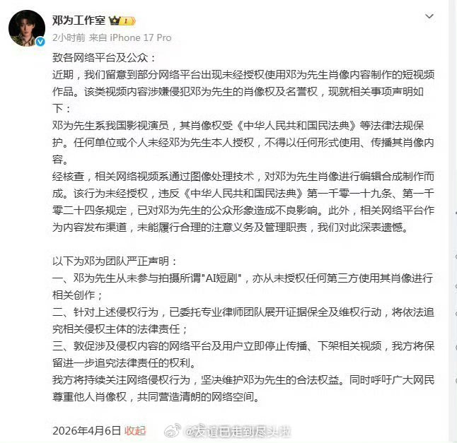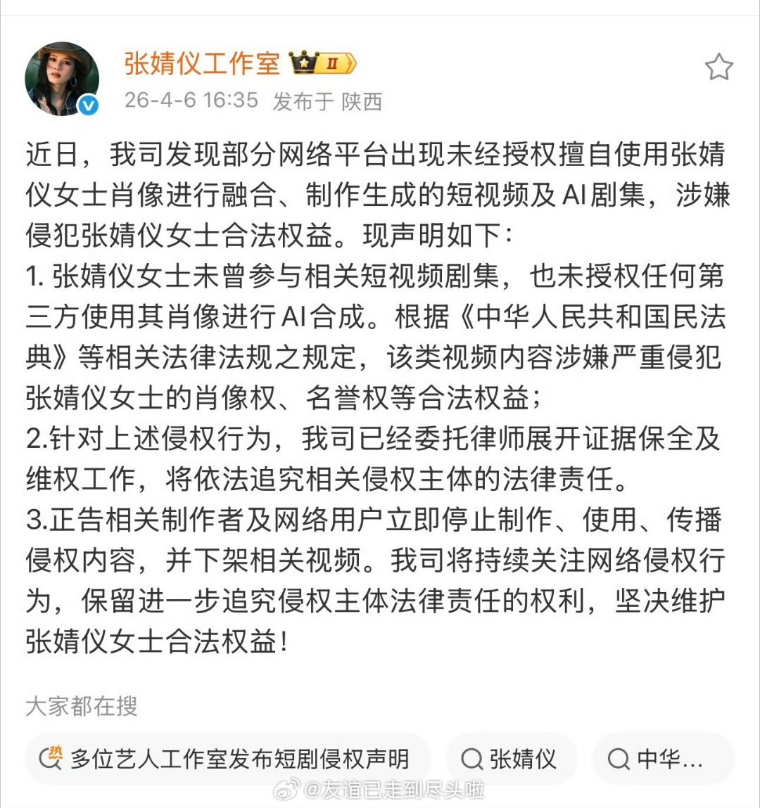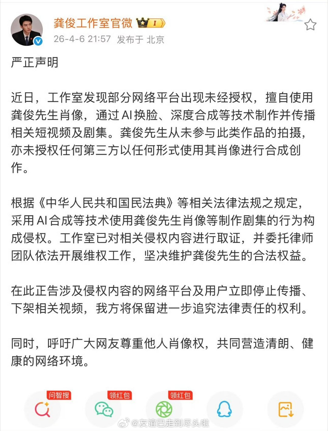 龚俊,邓为,张婧仪工作室都发了禁止未授权擅自使用艺人肖像进行ai创作