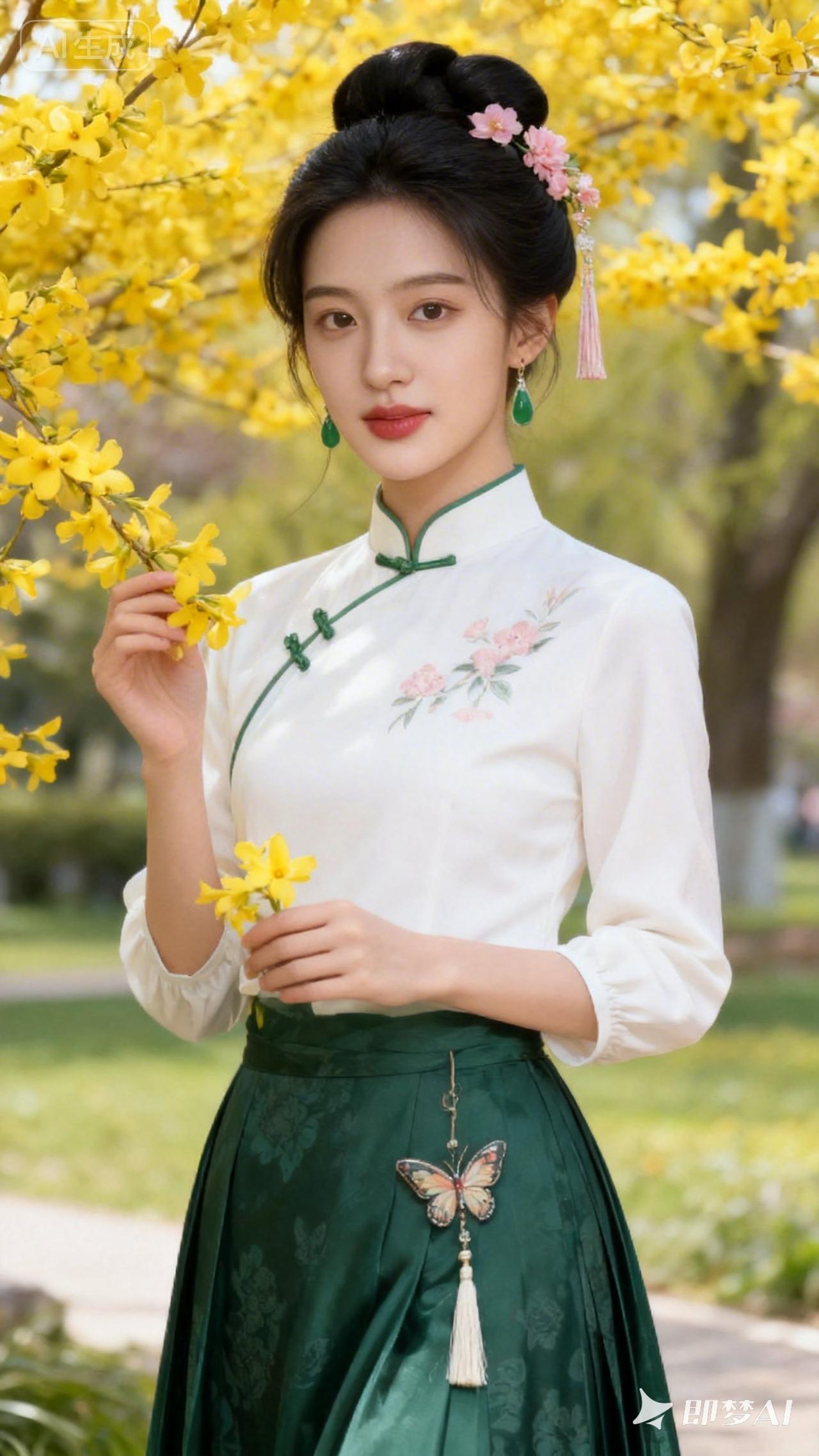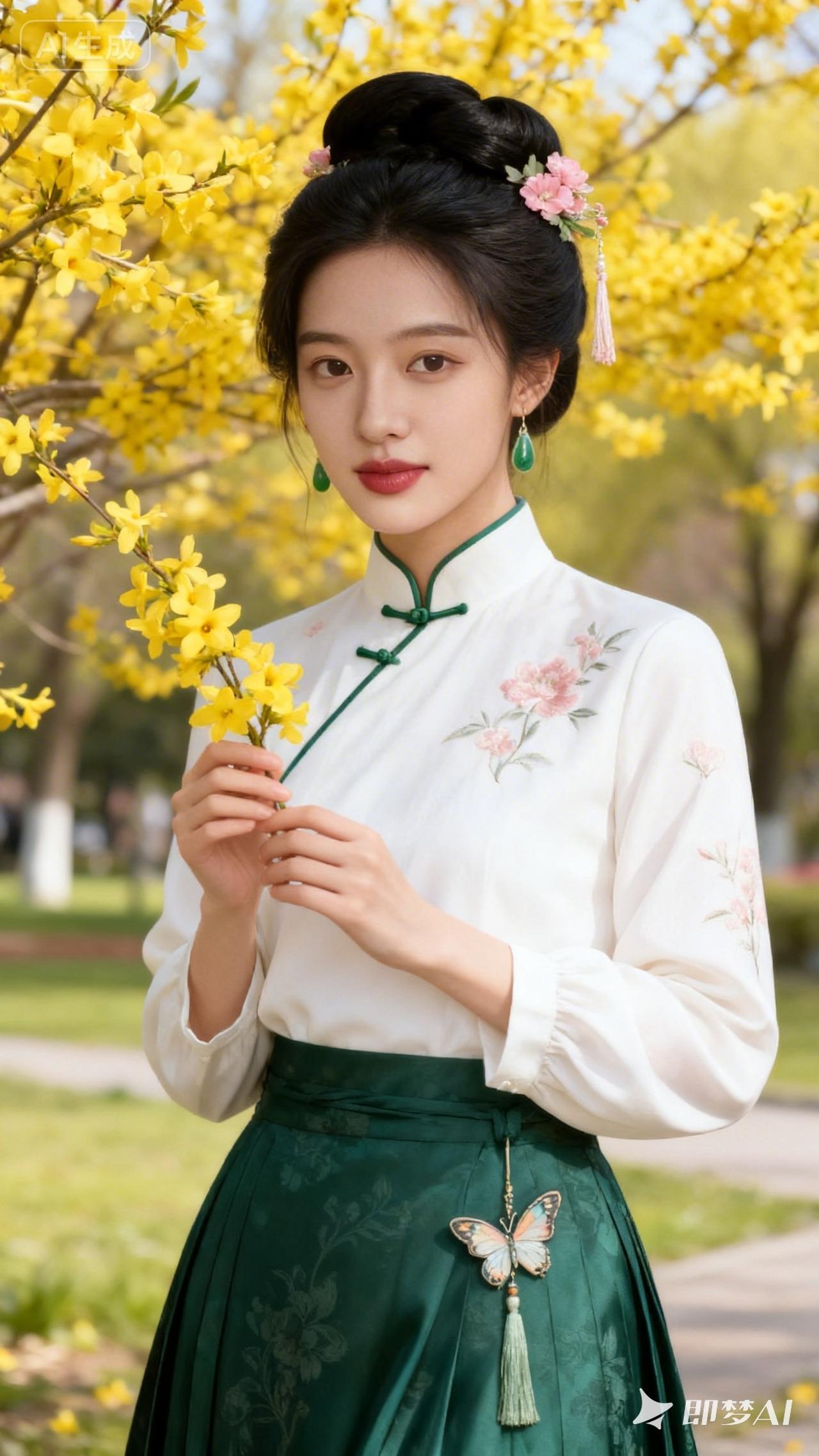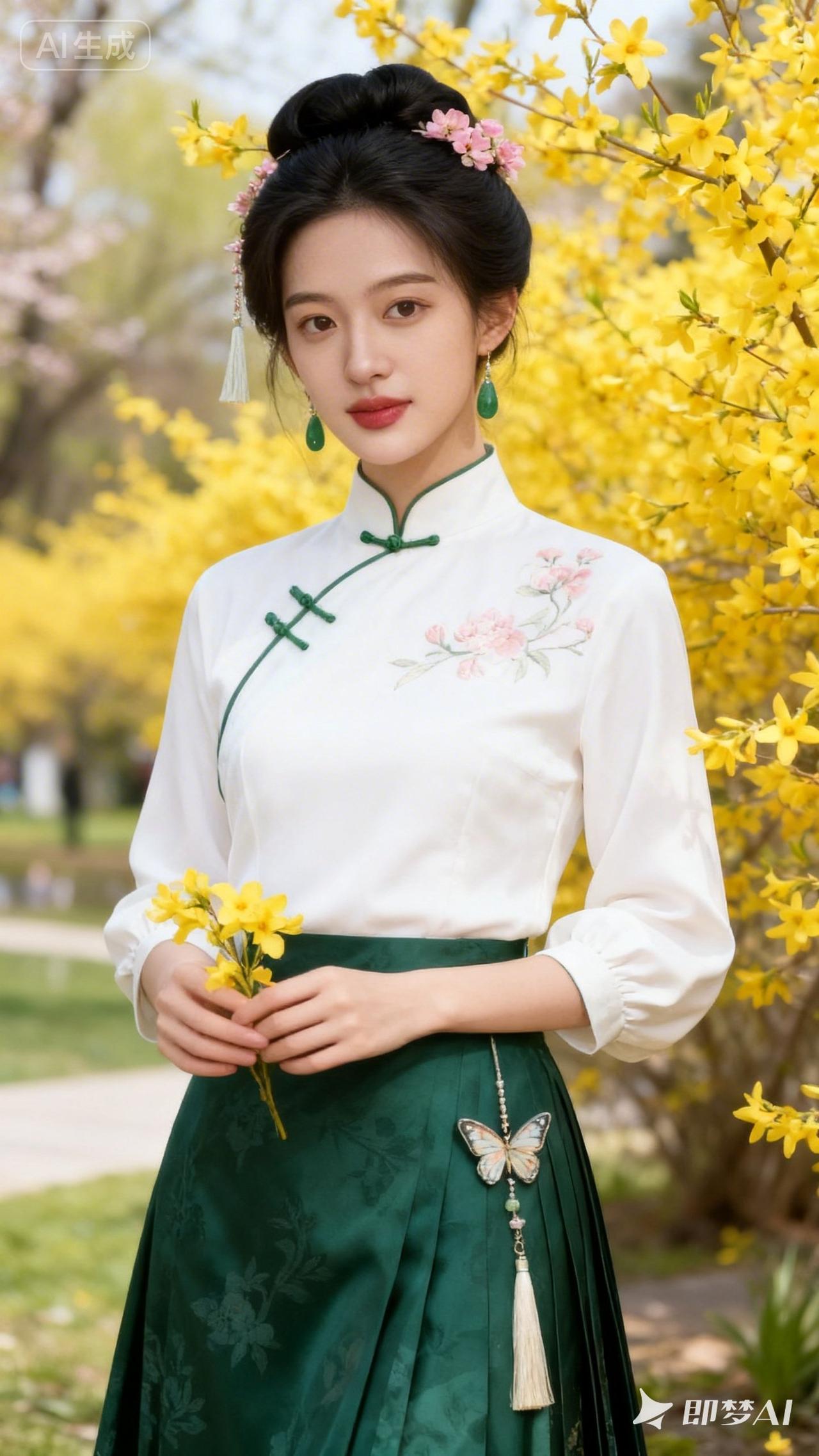 春日花海中的古典美人,手持黄花,优雅动人。