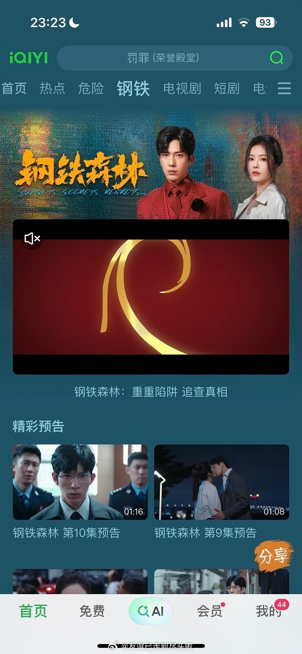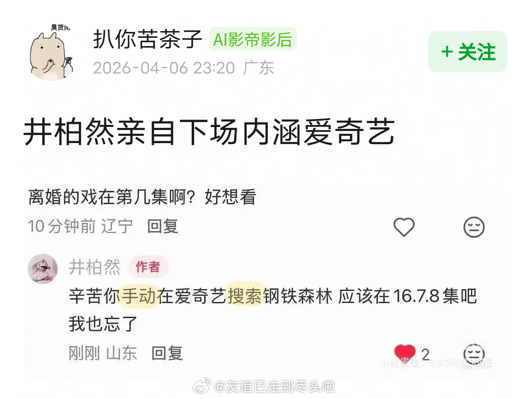 井柏然让观众辛苦一下,在爱奇艺上手动搜索《钢铁森林》,网友说这是在内涵爱奇艺,没