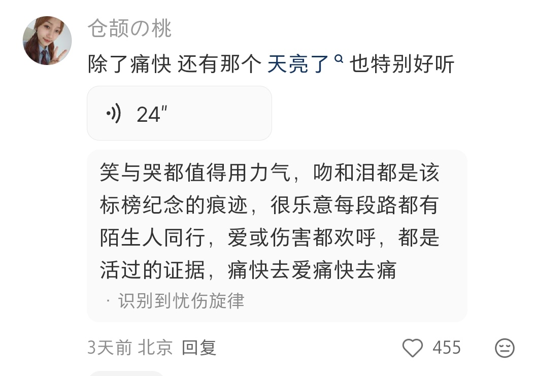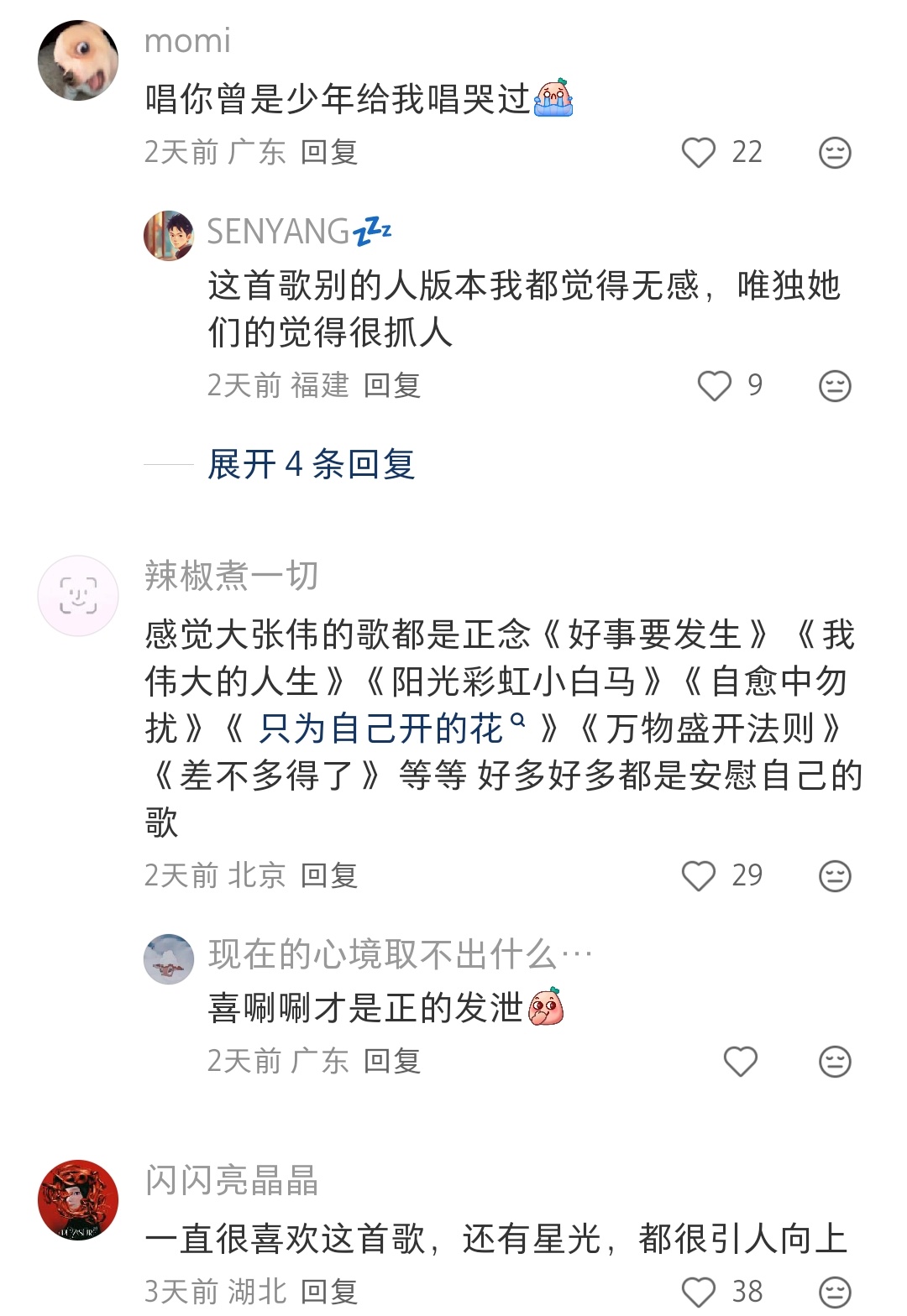 she的很多歌词都很正能量,以前的老歌真的强 。而现在的口水歌全都是靠曲子火的,歌词早已经没人在意了
