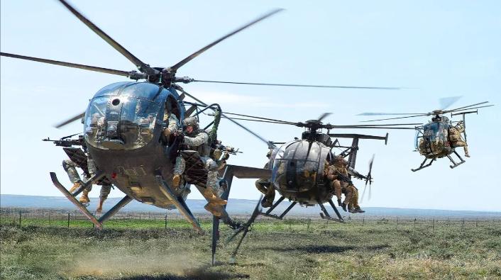 AH-6"小鸟"直升机在美军特种部队里可是"香饽饽",它轻便、噪音小、机动性强,六桨叶设计比老款四桨叶载重多30%。