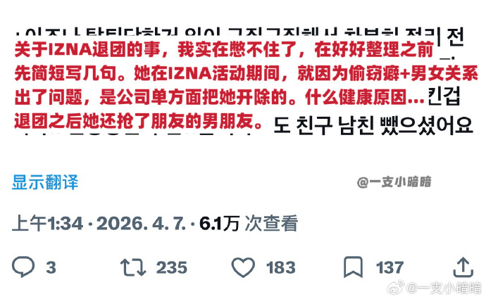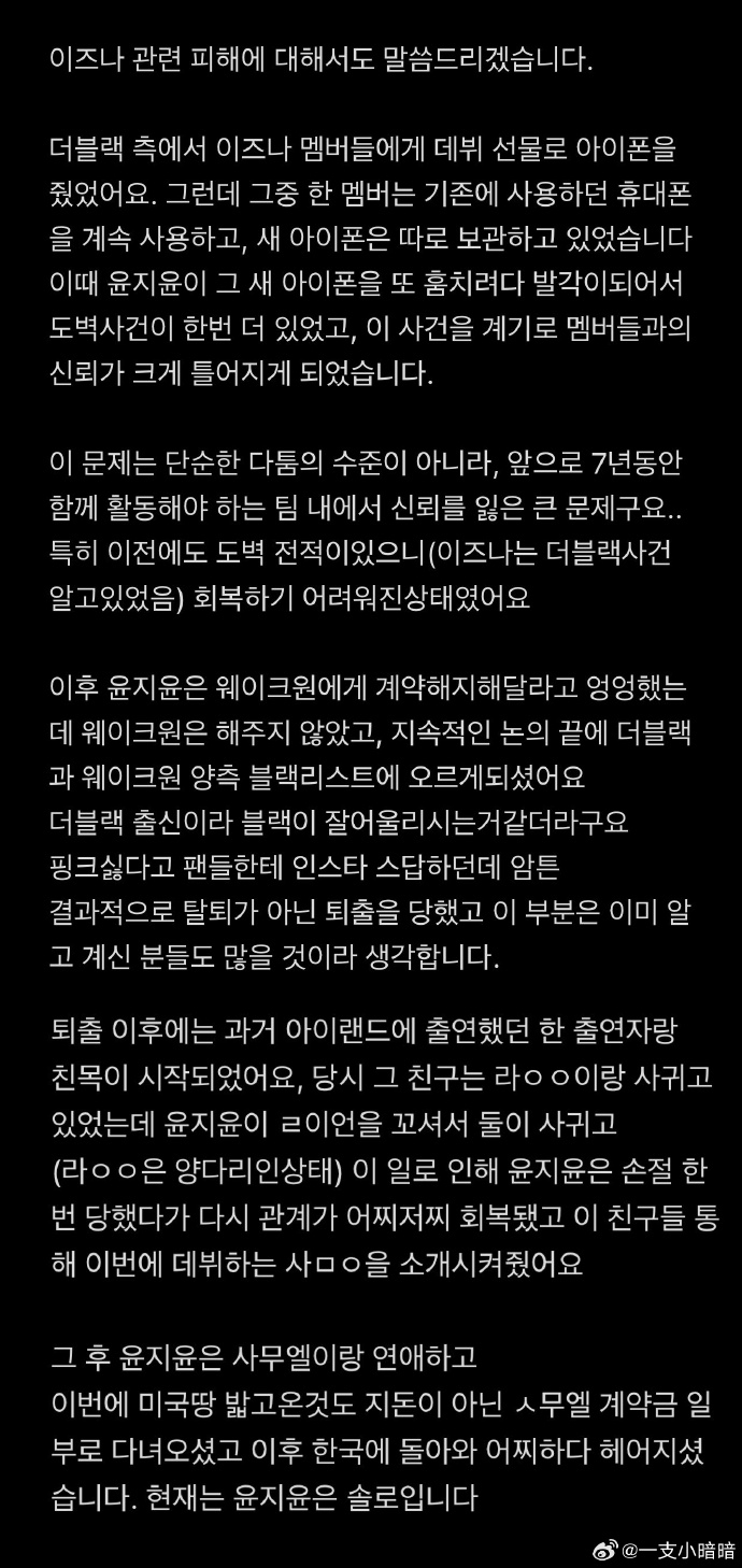 曝IZNA前成员尹智允退团原因曝IZNA前成员尹智允偷窃 女团IZNA成员尹智允在暂停活动6个月后决定退团,有爆料称她退团的原因是偷窃癖+男女关系问题,被公司单方面开除。