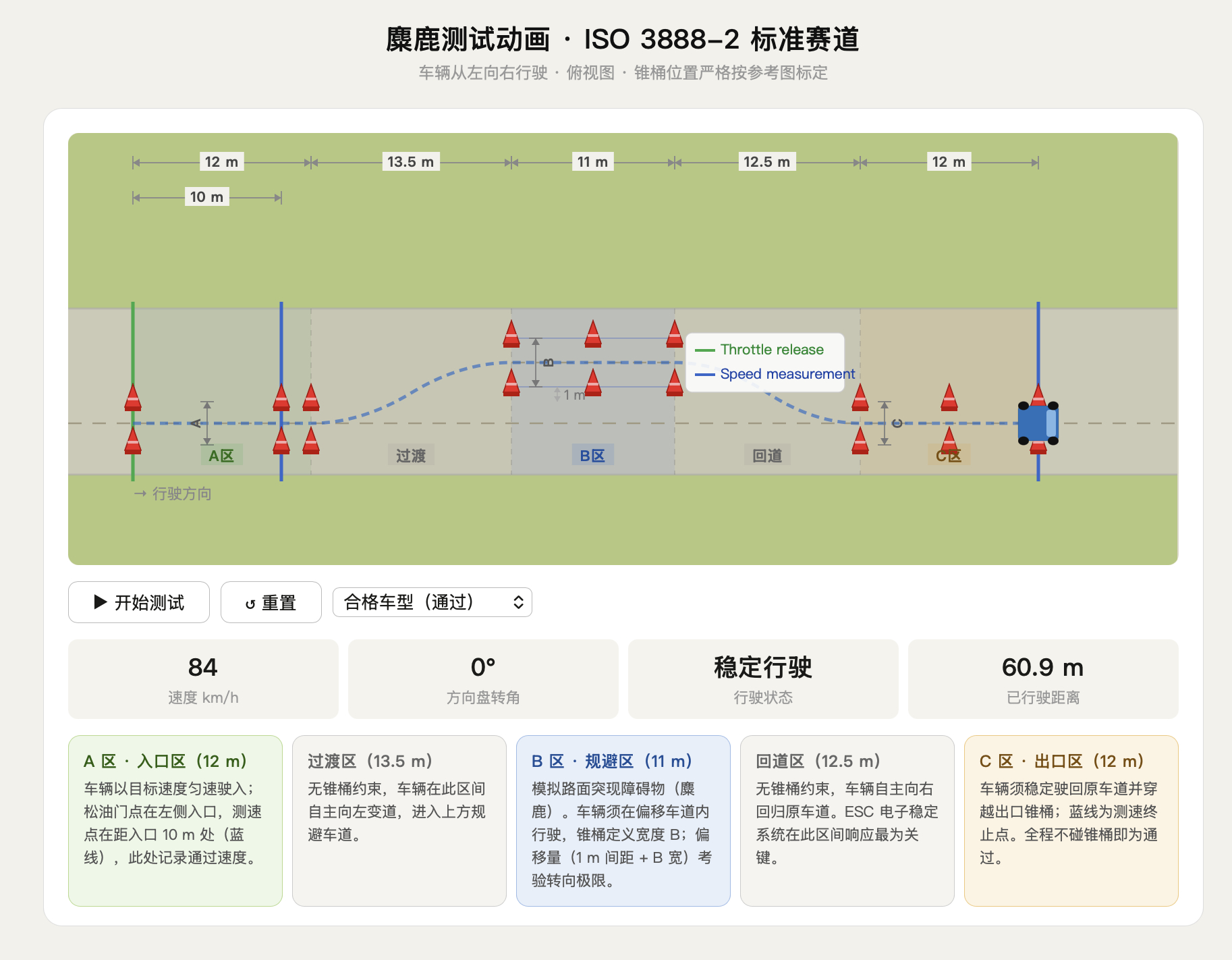 做了一个麋鹿测试的动画图,直观的对比失控/通过的车辆动态、ABC区的功能也都标注