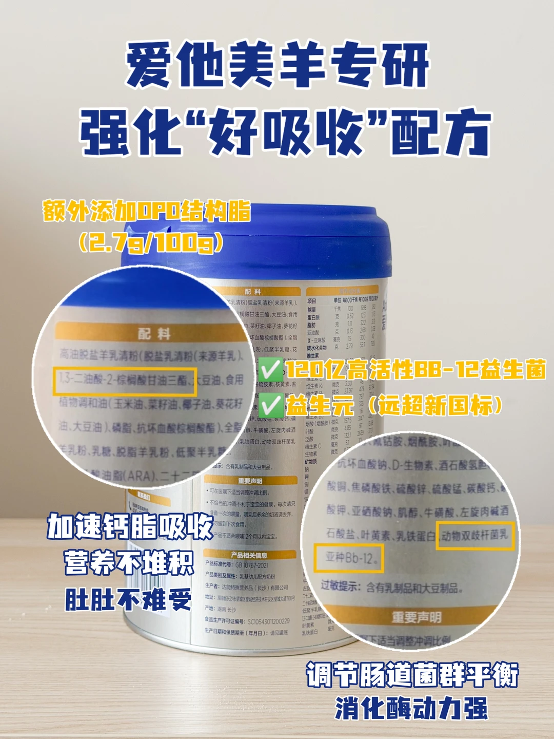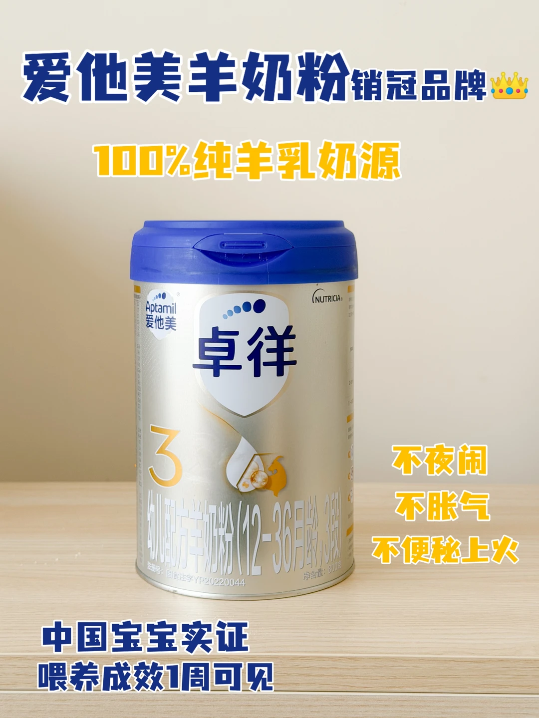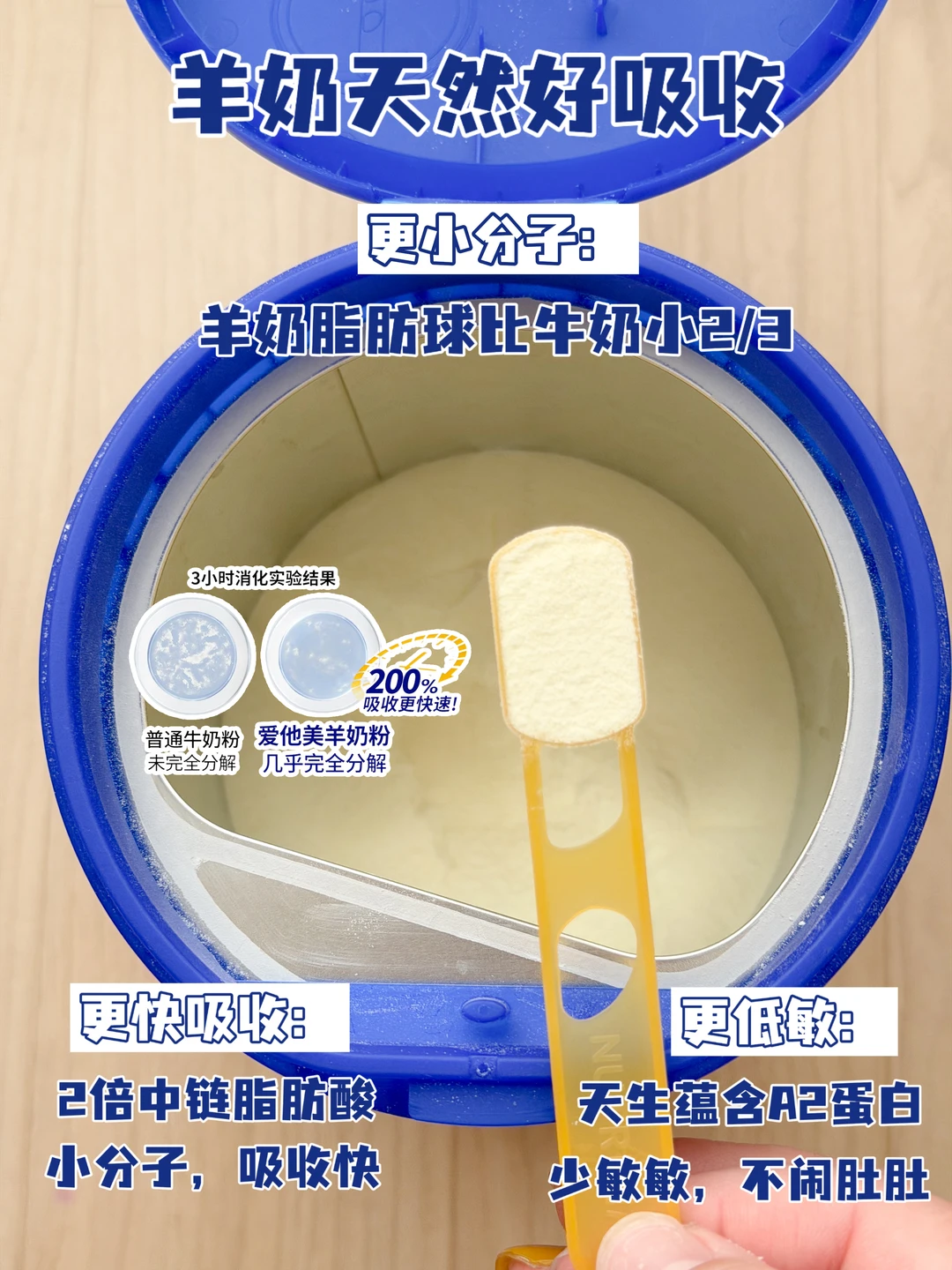 爱他美羊奶粉是100%纯羊乳奶源,羊奶小分子天然好吸收,含A2蛋白,更少致敏蛋白,宝宝喝下来肚肚一直很舒服。