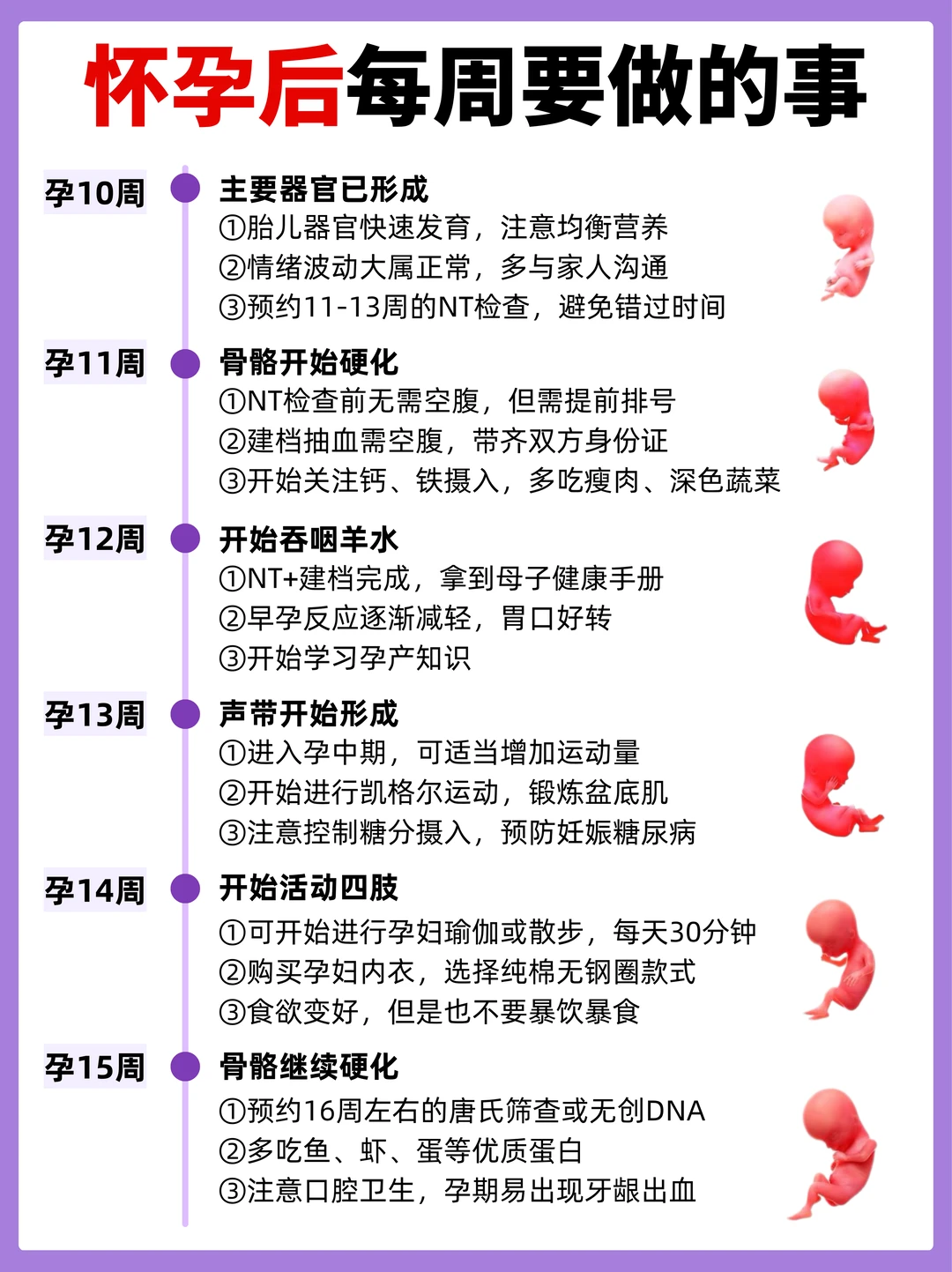 - 孕9-12周:胎盘开始形成,预约NT检查,12周完成建档拿到母子手册