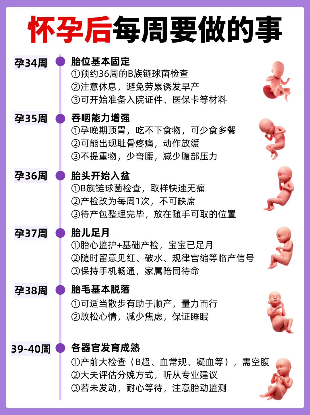 - 孕34-37周:胎位基本固定,预约B族链球菌检查,待产包整理好放在随手可取的地方