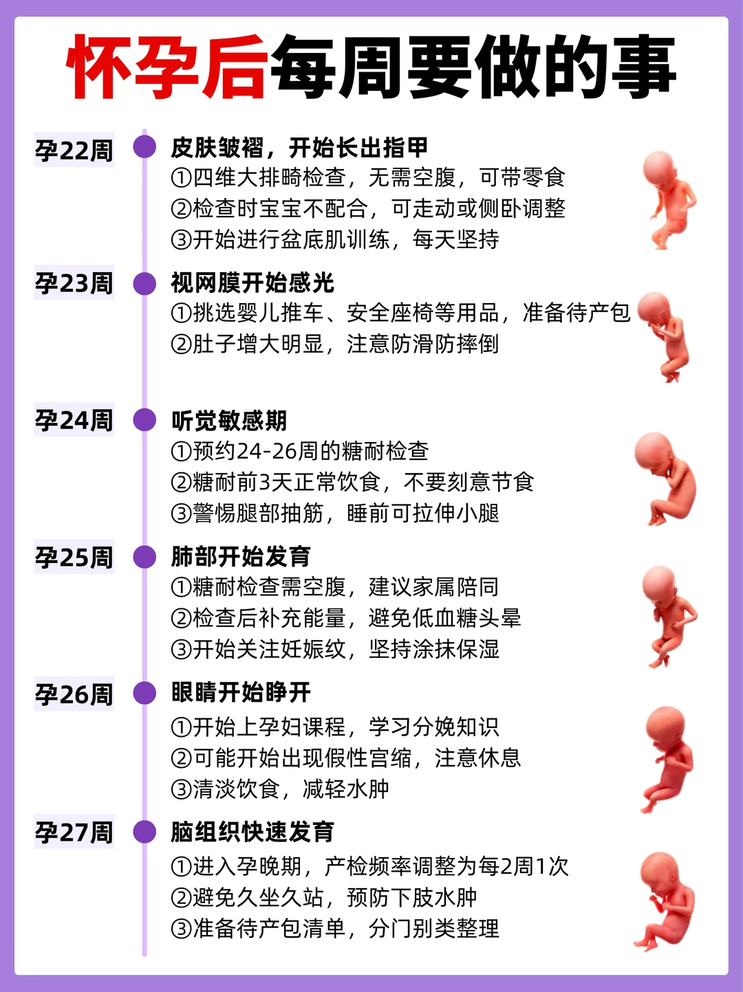 - 孕21-27周:准备婴儿大件,做盆底肌训练,预约糖耐检查,进入孕晚期后产检改为每2周1次