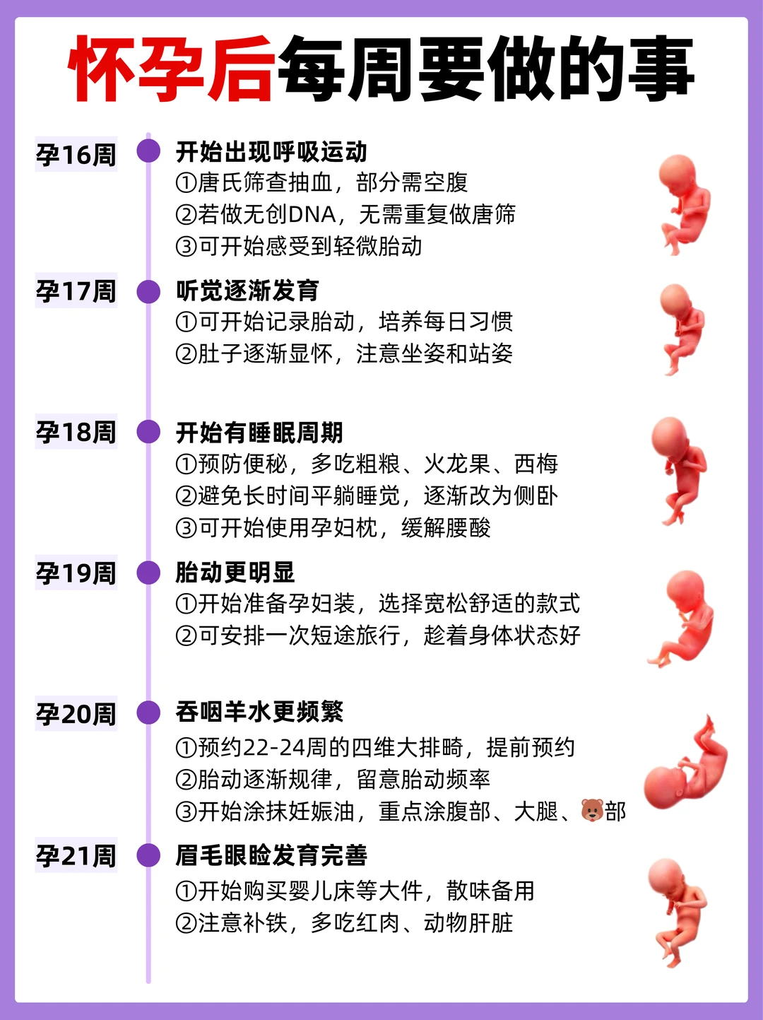 - 孕17-20周:开始感受胎动,记录胎动频率,提前预约四维大排畸