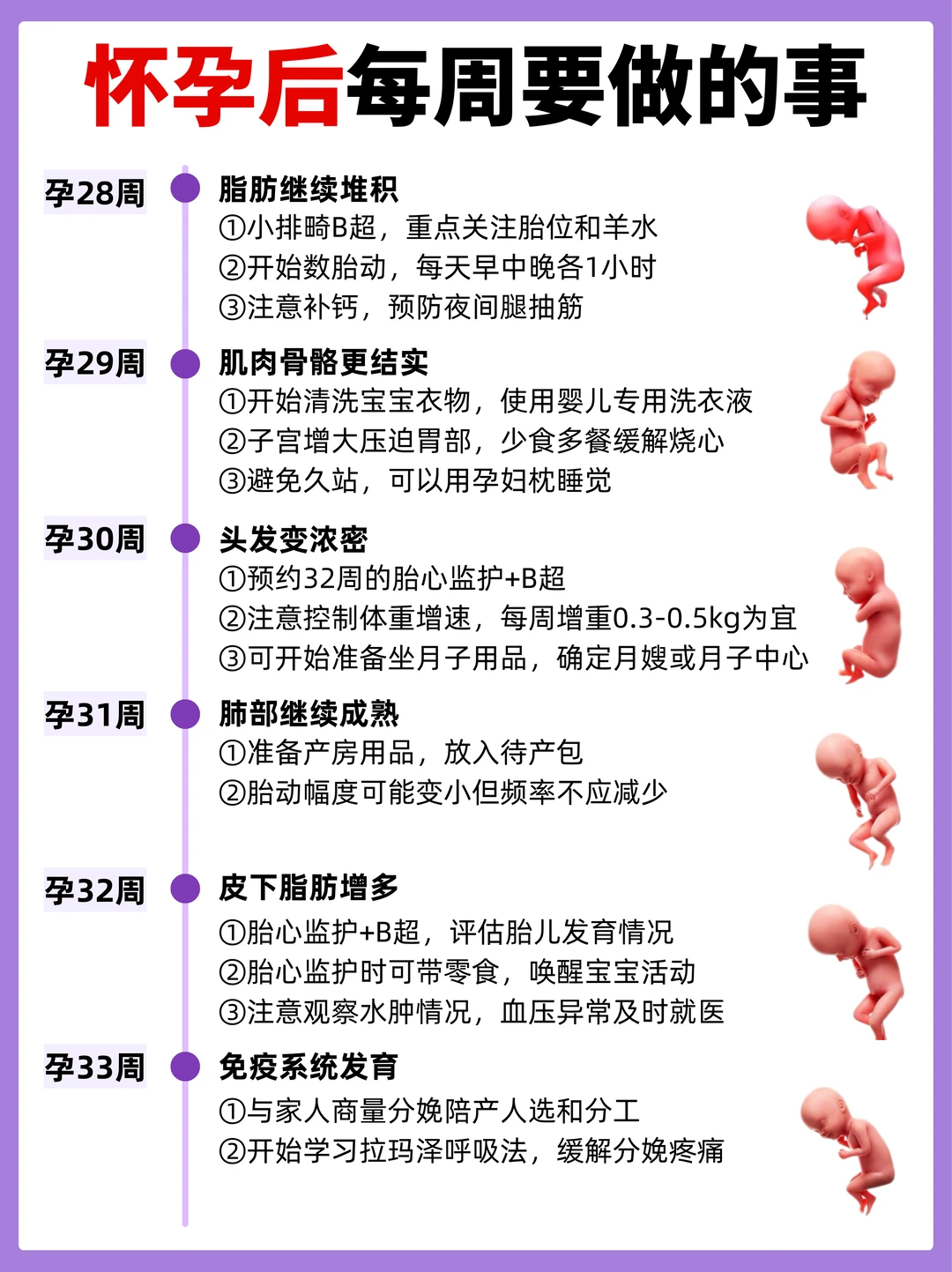 - 孕28-33周:开始数胎动,每周增重不超0.5kg,准备待产包,学习分娩知识