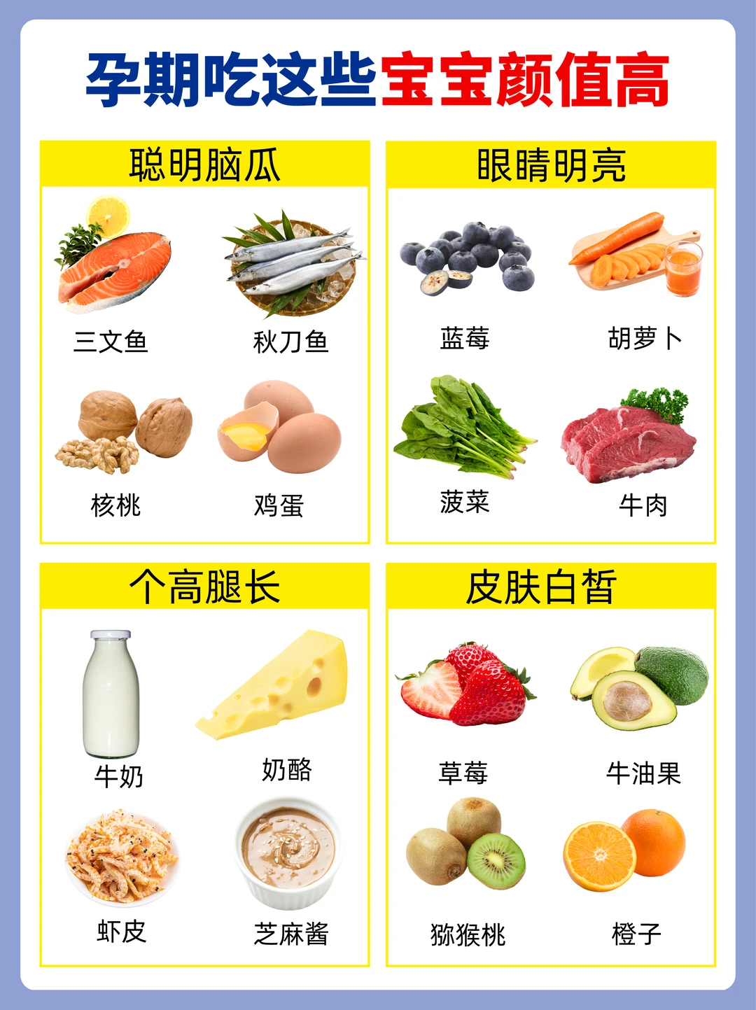 除了关注这些信号,孕期饮食也至关重要。想要宝宝聪明又漂亮,可以多吃这些食物: