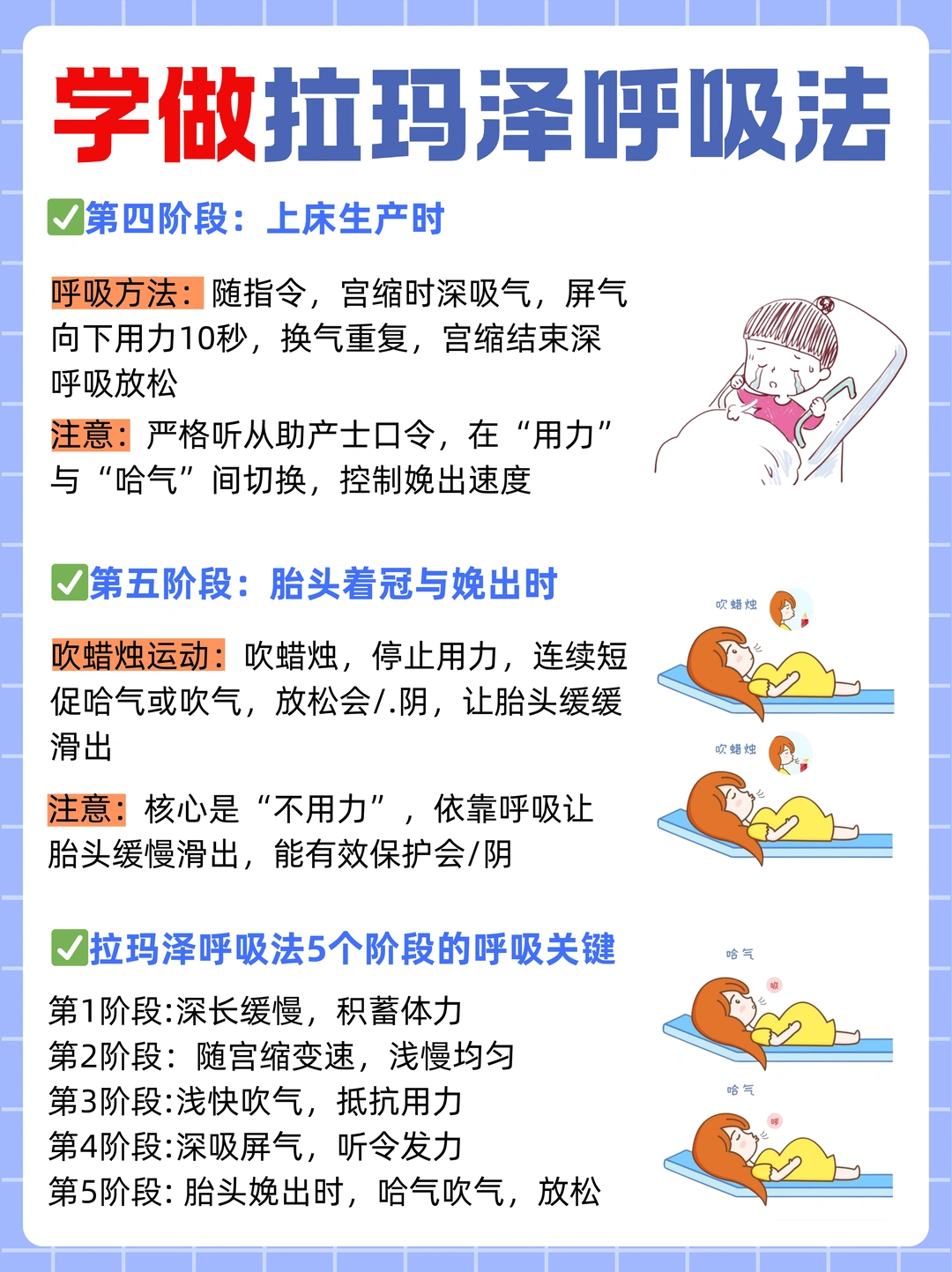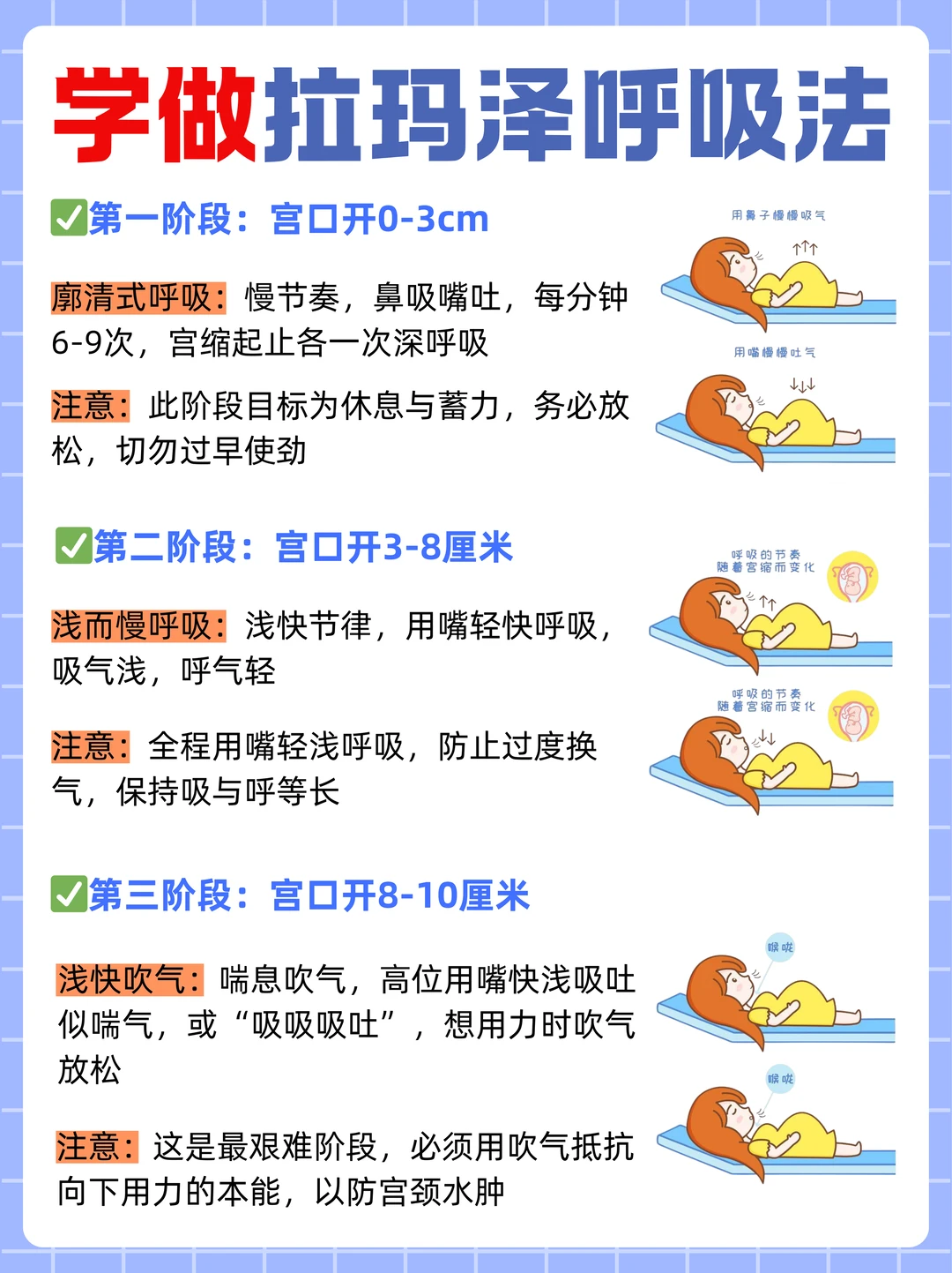 如果说发力是顺产的“硬实力”,那拉玛泽呼吸法就是顺产的“软实力”,能帮孕妈有效缓解宫缩疼痛、把控产程节奏。宫口开0-3cm时,用廓清式呼吸,慢节奏鼻吸嘴吐,每分钟6-9次,重点是休息蓄力,别过早使劲;宫口开3-8cm,换成浅而慢的呼吸,用嘴轻快呼吸,保持吸与呼等长,避免过度换气;宫口开到8-10cm的艰难阶段,要做浅快吹气,用“吸吸吸吐”的喘息式呼吸抵抗向下用力的本能,防止宫颈水肿;上床生产时,需听从助产士指令,宫缩时深吸气屏气用力10秒,换气后重复,宫缩结束再深呼吸放松;到胎头着冠娩出时,要做“吹蜡烛”式的短促哈气,停止用力让胎头缓缓滑出,能有效保护会阴。
