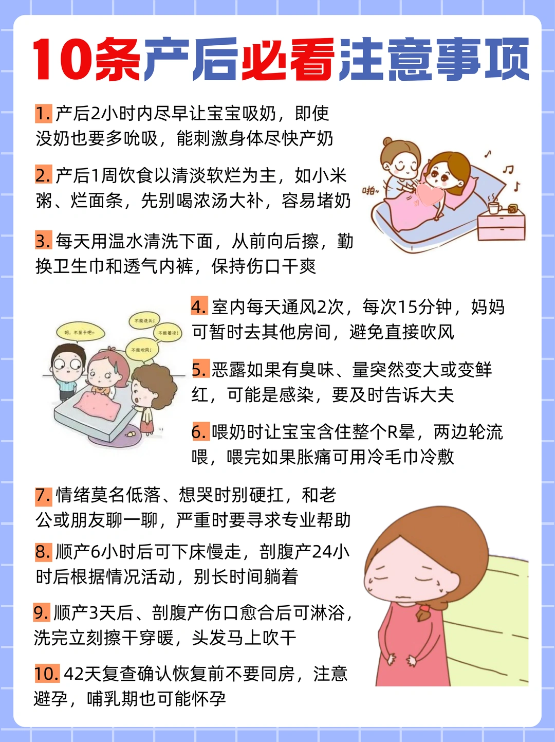 还要留意身体的信号,恶露若有臭味、量突然变大或变鲜红,可能是感染征兆,要及时告知医生;喂奶时让宝宝含住整个乳晕,涨奶胀痛可用冷毛巾冷敷。活动方面,顺产6小时后可下床慢走,剖腹产24小时后根据情况活动,别长时间躺着;顺产3天后、剖腹产伤口愈合后可淋浴,洗完立刻擦干保暖。另外,42天复查确认恢复前不要同房,哺乳期也需做好避孕,避免意外怀孕。