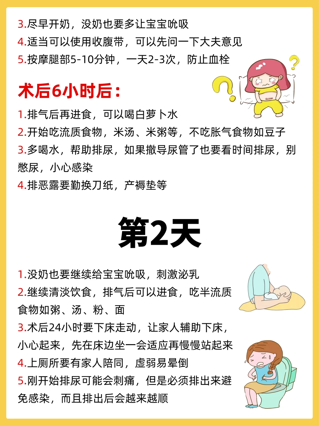 术后24小时要在家人辅助下下床走动,先在床边坐适应后再站起,避免晕倒。饮食上继续清淡半流食,不吃豆子、蛋奶等易胀气食物。排尿时可能会有刺痛感,但必须及时排出以防感染。同时要多让宝宝吮吸,即使没奶也能促进乳汁分泌,还可按摩腿部预防血栓。