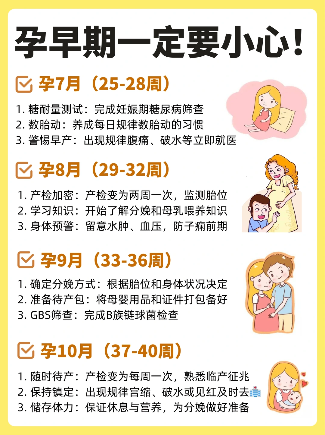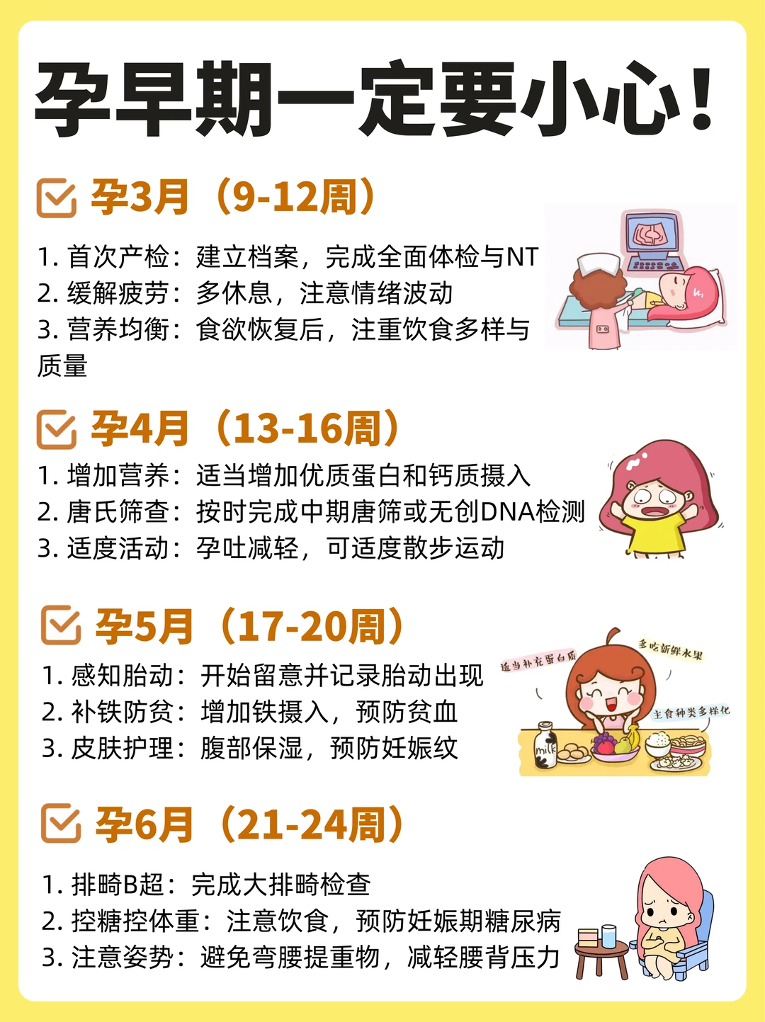 - 孕3月(9-12周):尽快建立产检档案,完成NT检查和全面体检;多休息缓解疲劳,情绪波动时及时向家人求助;食欲恢复后注重饮食多样,把优质蛋白、维生素吃到位。