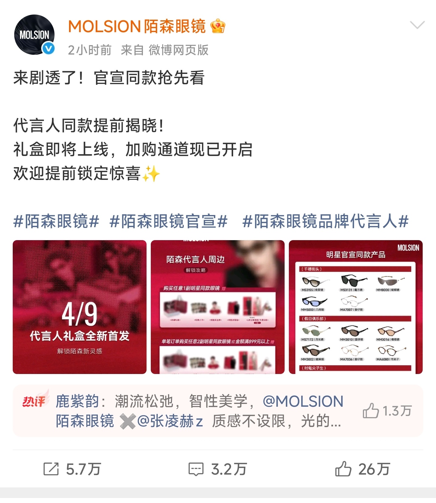 张凌赫粉丝,陌森眼镜礼盒预告博2小时赞26万。为了防止你们骄傲,给你们看一组数据