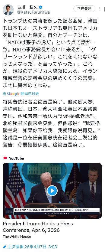 日本安全专家古川胜久今天(4月7日)写道:“特朗普的记者会简直是疯了。他勃然大怒,声称韩国、日本、澳大利亚和英国不会帮助美国。他和普京一致认为‘北约是纸老虎’。北约秘书长前来会见他,但他却说:‘我要格陵兰岛,如果你不给我,我就跟你说再见。’这就是一位在任美国总统在记者会上发出的警告,称要摧毁伊朗。这简直是疯了。”